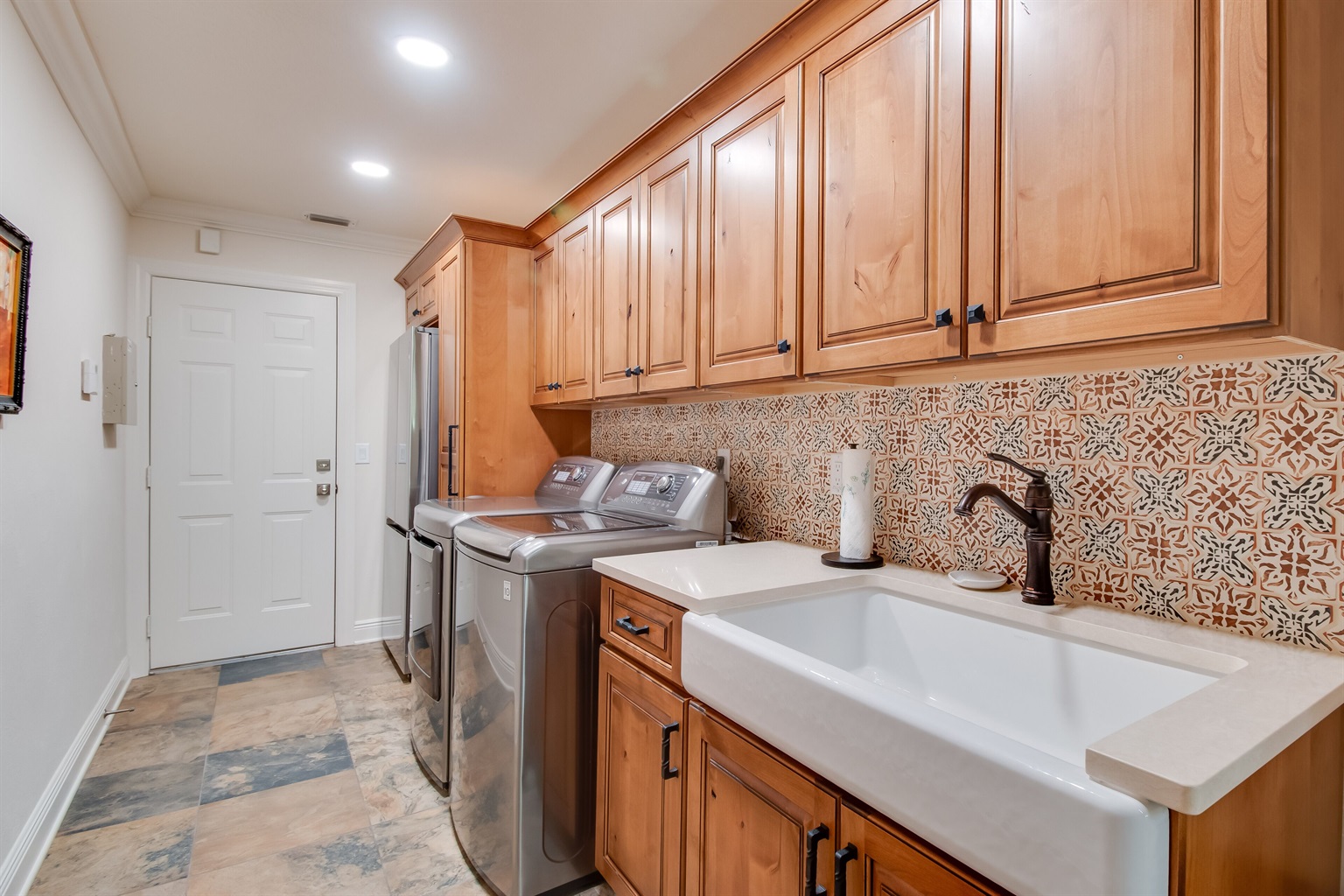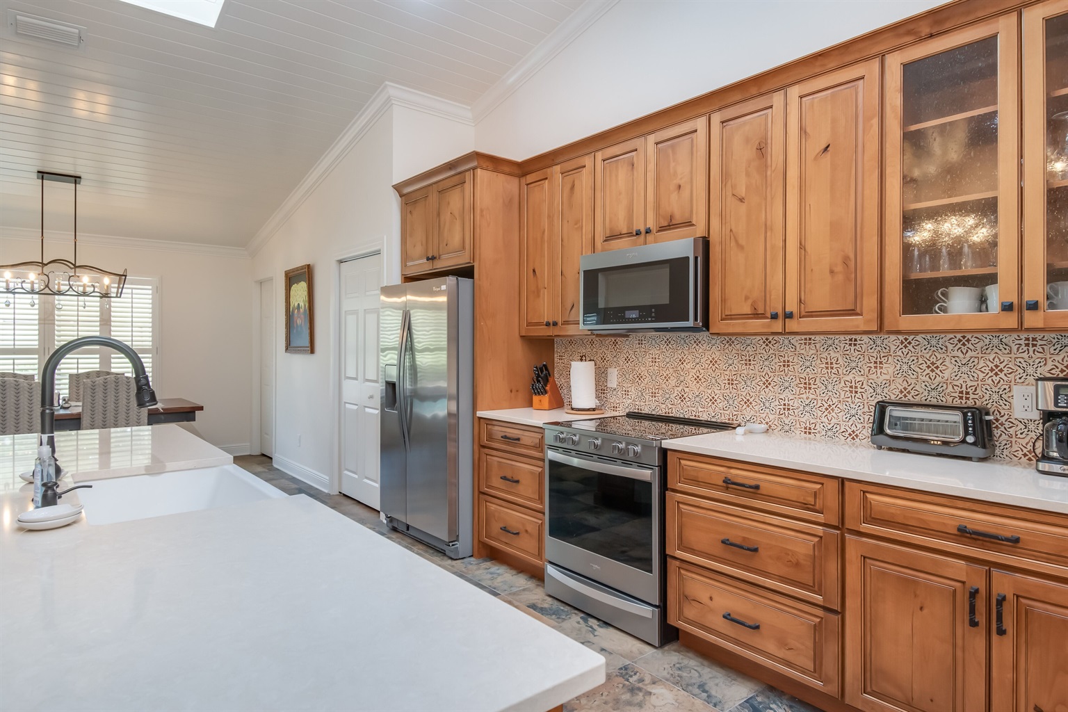 The large kitchen/ bar area in the house can seat four. Close to the bar area is seating for four more, all under pretty pendants which add an air of design sophistication. Two refrigerators are in the house as well as the latest in appliances. The kitchen, bar area, and laundry all have hand-painted Tabarka tile from California and warm chestnut-colored cabinets.
