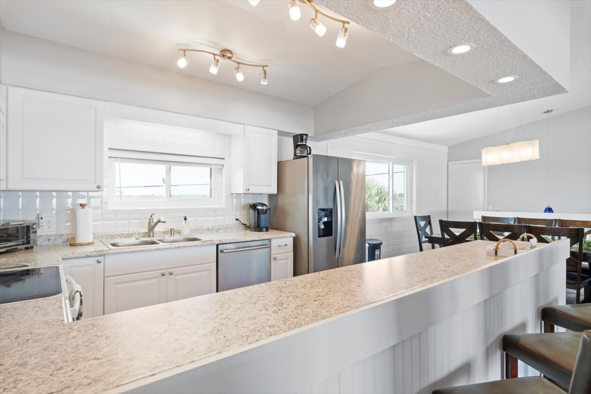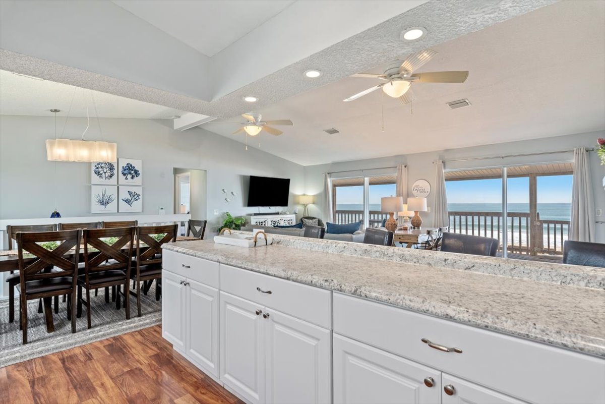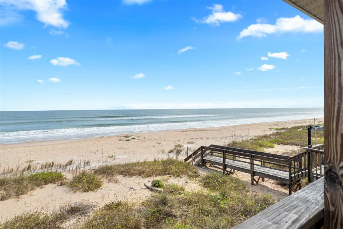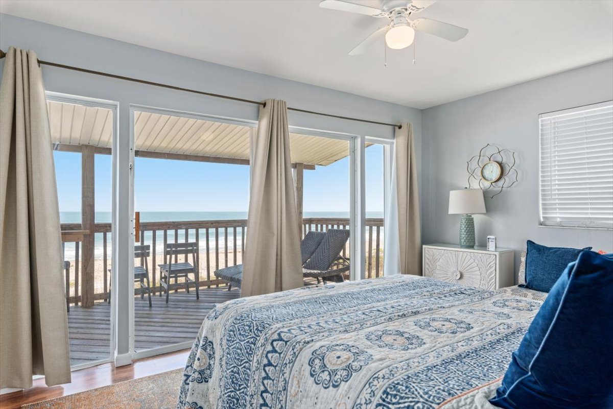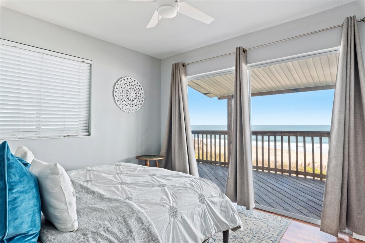Welcome to “Dolphin Dunes”. This roomy 4 bedroom, 3 bath home has been recently remodeled! All of the bedrooms and the living areas are located on the 2nd floor, which means that you will have incredible views of the beach and ocean from just about anywhere in the house. The open floor plan is perfect for enjoying the company of friends and family. Dolphin Dunes will comfortably sleep 8 adults. There are two bedrooms on the ocean side of the house. Each has a queen bed, and magnificent views of the ocean. These beachside rooms have sliding glass doors that lead out to the oceanfront balcony. The third bedroom also has a queen bed and the 4th bedroom has two twin beds, perfect for teens or single adults. Each bedrooms feature high quality linens, towels, and comfortable beds. There 3 bathrooms total. Two upstairs and one one the beach level. One has a shower/bath tub combination, and the other two have walk-in showers. The bedrooms are in each corner of the house. The north bedrooms share the north bathroom, and the south bedrooms share the south bathroom. The third bathroom can be entered from the main level and or the beach.