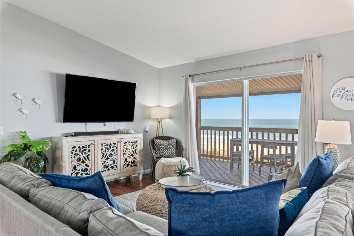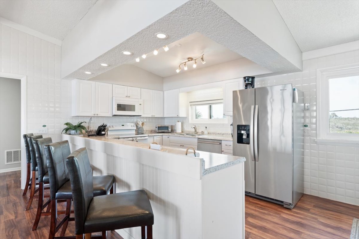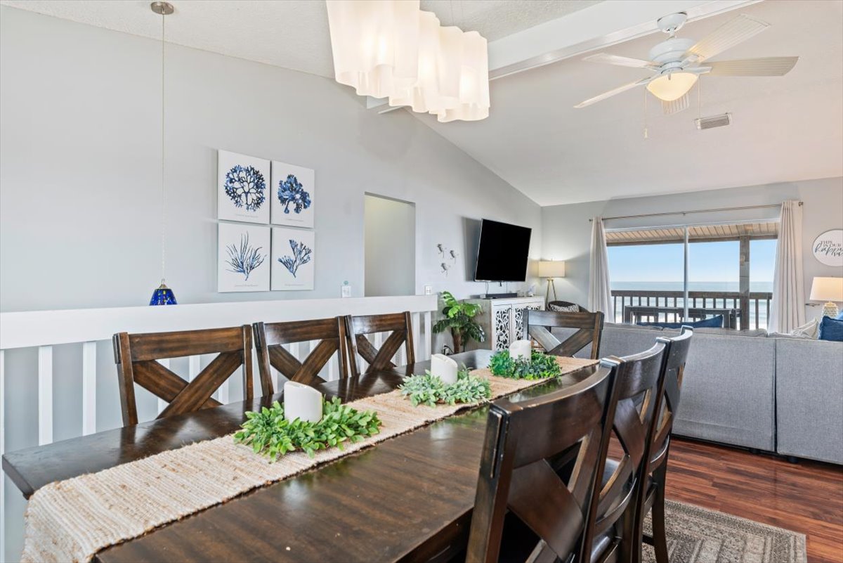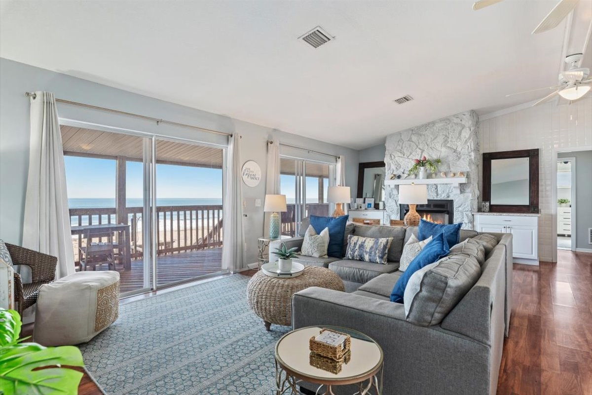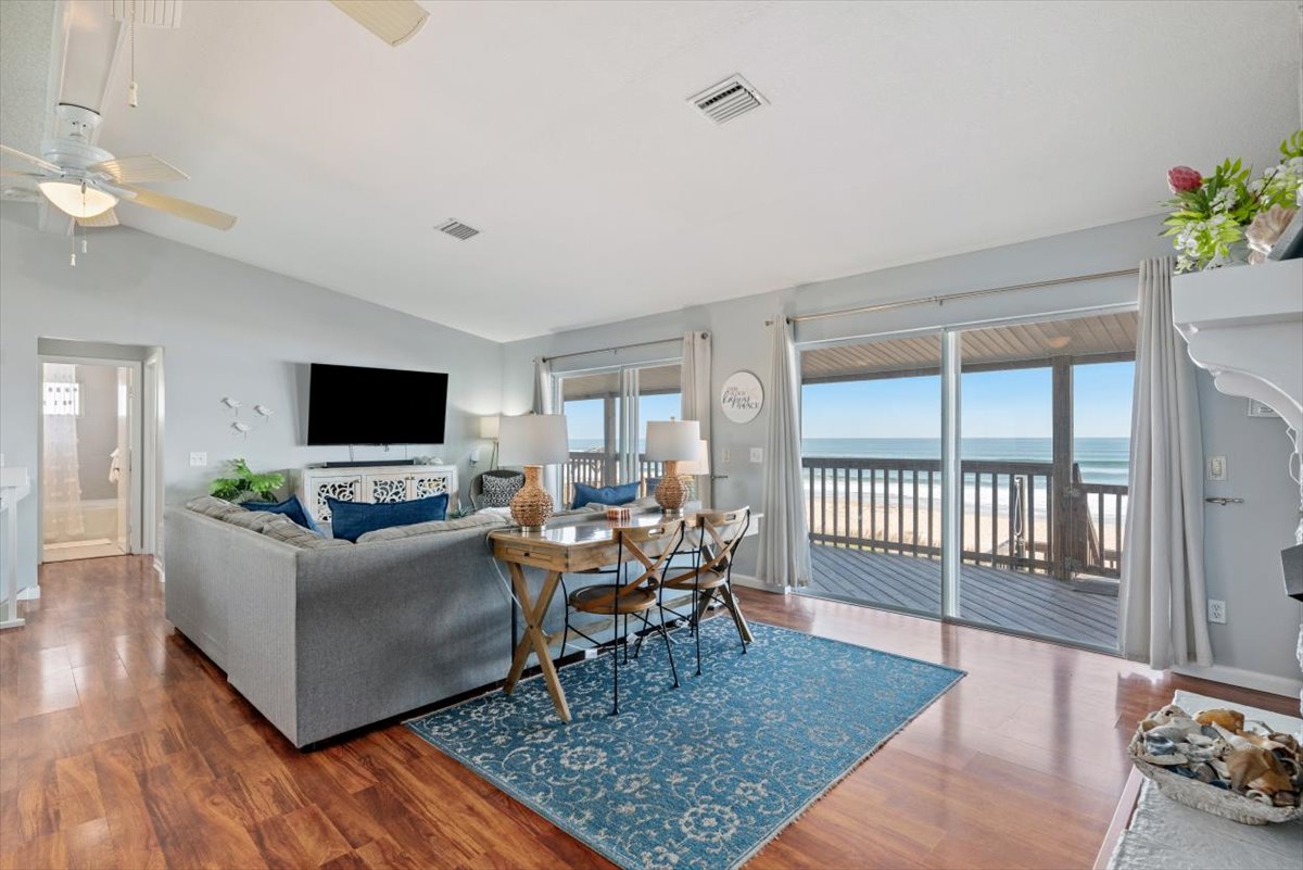 Welcome to “Dolphin Dunes”. This roomy 4 bedroom, 3 bath home has been recently remodeled! All of the bedrooms and the living areas are located on the 2nd floor, which means that you will have incredible views of the beach and ocean from just about anywhere in the house. The open floor plan is perfect for enjoying the company of friends and family. Dolphin Dunes will comfortably sleep 8 adults. There are two bedrooms on the ocean side of the house. Each has a queen bed, and magnificent views of the ocean. These beachside rooms have sliding glass doors that lead out to the oceanfront balcony. The third bedroom also has a queen bed and the 4th bedroom has two twin beds, perfect for teens or single adults. Each bedrooms feature high quality linens, towels, and comfortable beds. There 3 bathrooms total. Two upstairs and one one the beach level. One has a shower/bath tub combination, and the other two have walk-in showers. The bedrooms are in each corner of the house. The north bedrooms share the north bathroom, and the south bedrooms share the south bathroom. The third bathroom can be entered from the main level and or the beach.