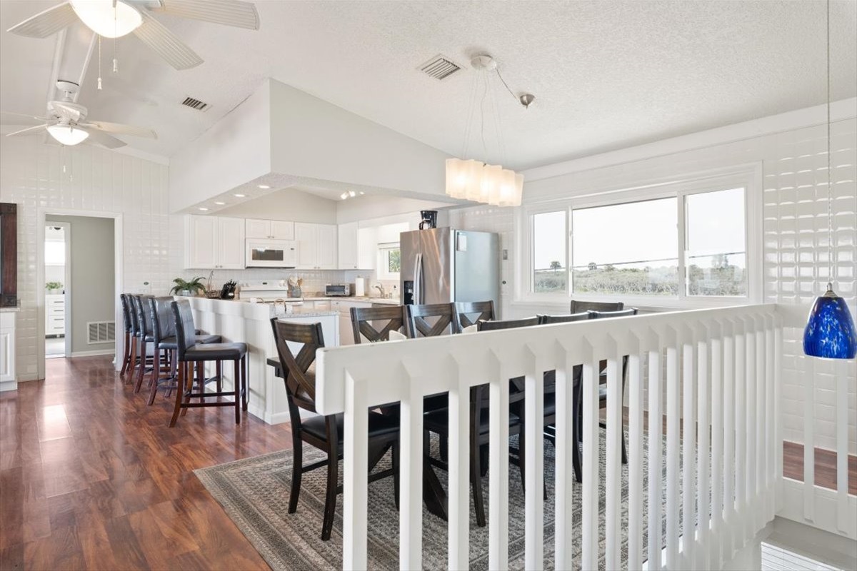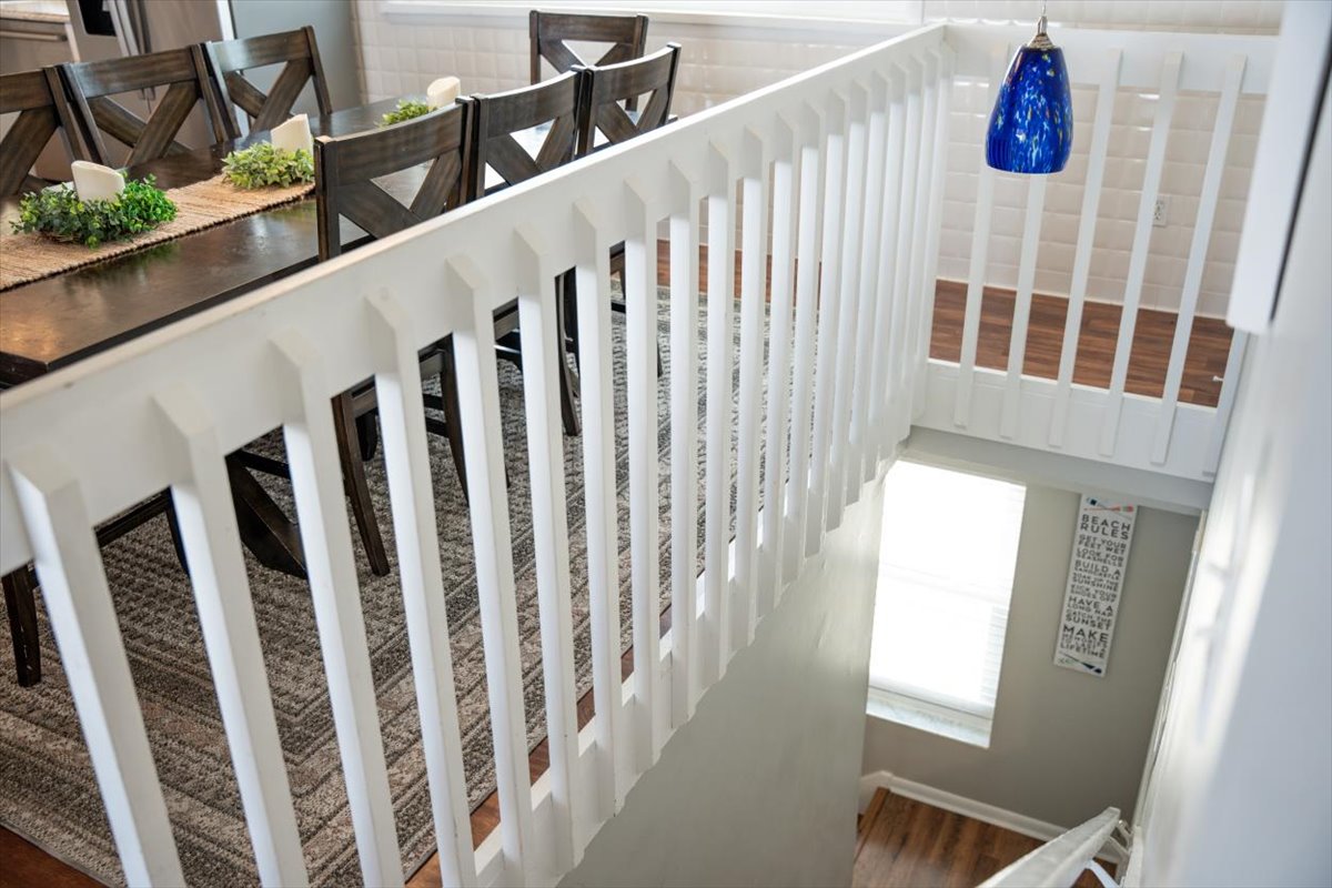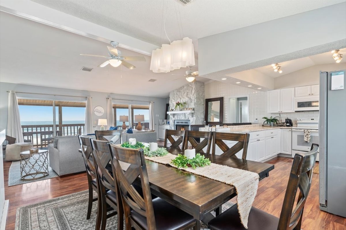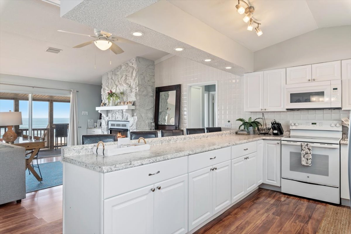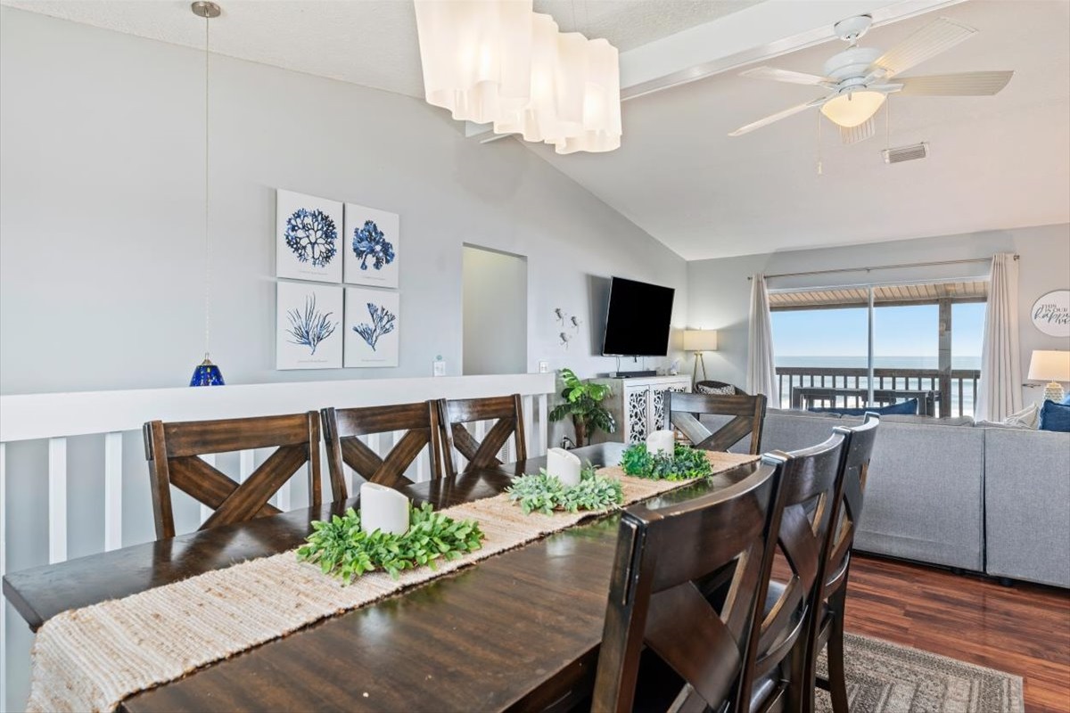 Welcome to “Dolphin Dunes”. This roomy 4 bedroom, 3 bath home has been recently remodeled! All of the bedrooms and the living areas are located on the 2nd floor, which means that you will have incredible views of the beach and ocean from just about anywhere in the house. The open floor plan is perfect for enjoying the company of friends and family. Dolphin Dunes will comfortably sleep 8 adults. There are two bedrooms on the ocean side of the house. Each has a queen bed, and magnificent views of the ocean. These beachside rooms have sliding glass doors that lead out to the oceanfront balcony. The third bedroom also has a queen bed and the 4th bedroom has two twin beds, perfect for teens or single adults. Each bedrooms feature high quality linens, towels, and comfortable beds. There 3 bathrooms total. Two upstairs and one one the beach level. One has a shower/bath tub combination, and the other two have walk-in showers. The bedrooms are in each corner of the house. The north bedrooms share the north bathroom, and the south bedrooms share the south bathroom. The third bathroom can be entered from the main level and or the beach.