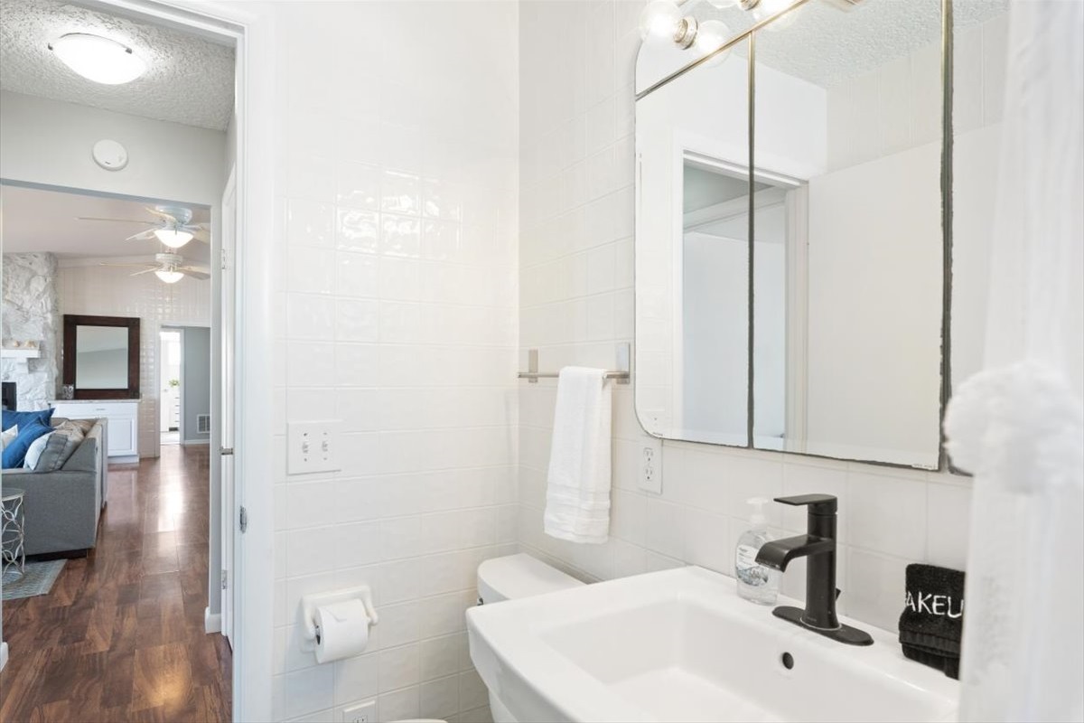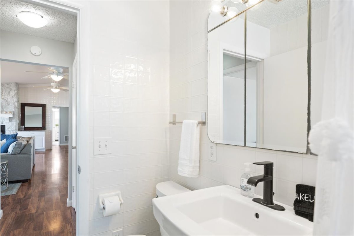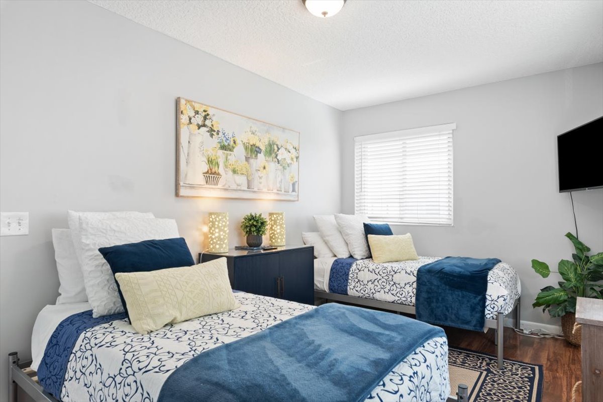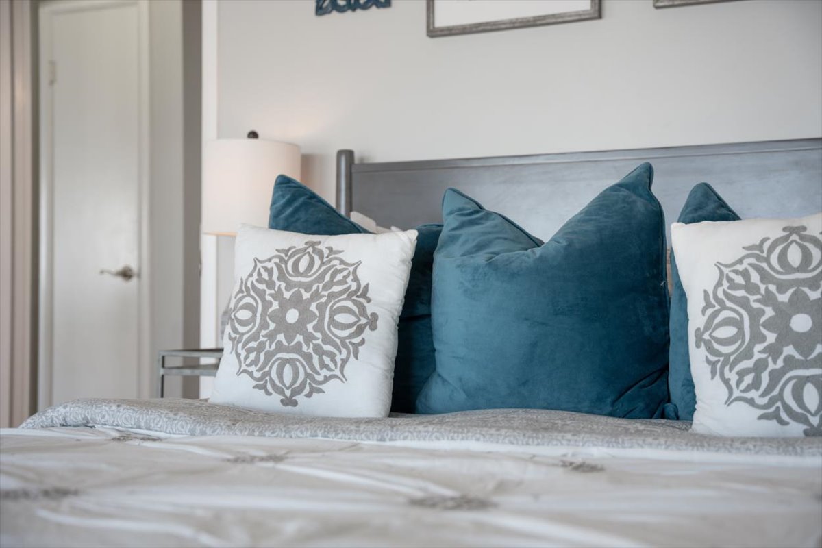 The kitchen is fully equipped and is nice and spacious. It opens up to the living room and the dining area. The breakfast bar in the kitchen seats 6, plus there is seating for 8 at the dining table. The living room is bright and airy and features plenty of seating, a desk for working, and a wet bar. The living room has a 65″ Roku Smart TV with plenty of local and specialty channels. The fireplace is decorative only (non-functioning). There are also Roku TVs in the two roadside bedrooms. There is high speed Xfinity WIFI throughout the house.