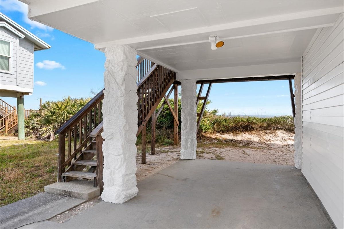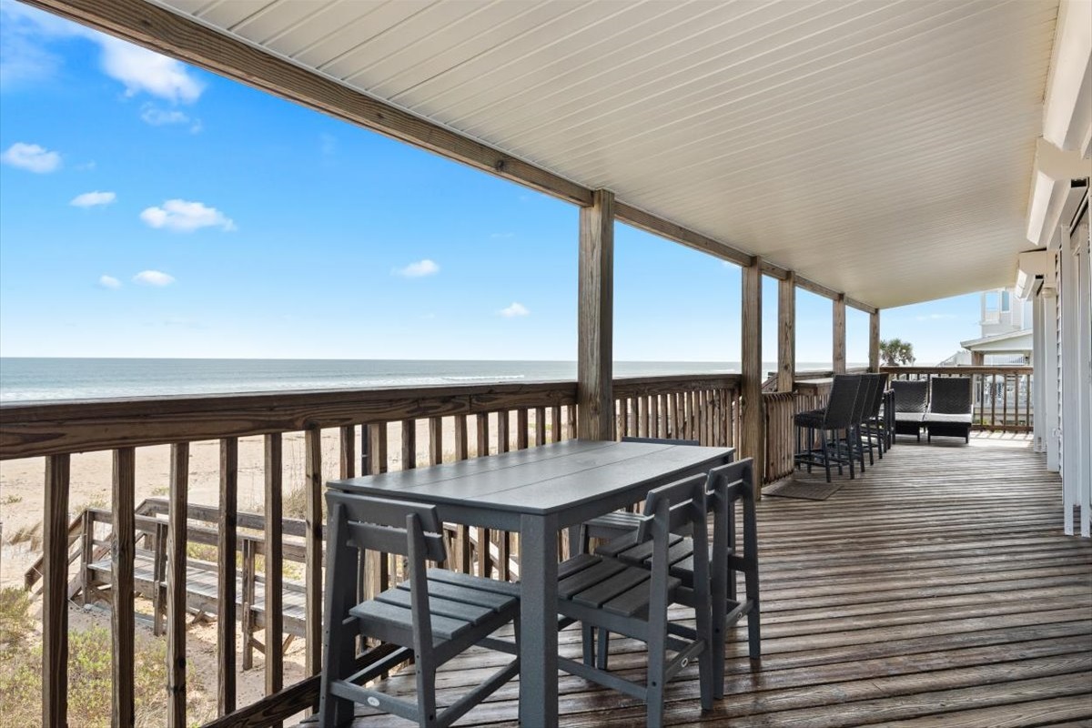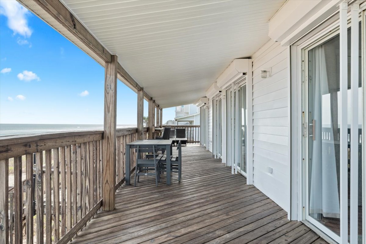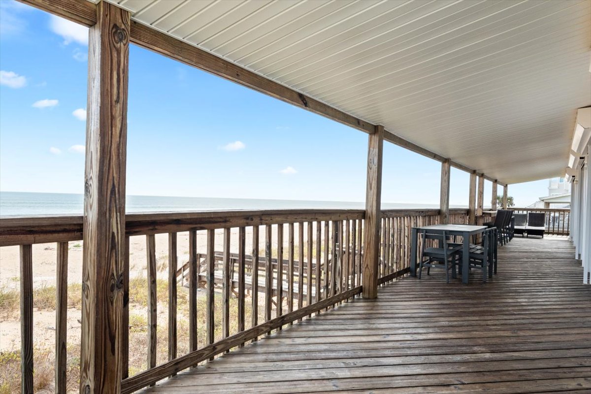 Spanning the width of the house is a covered, oceanfront balcony. It can be accessed from the living room and both of the ocean-side bedrooms. The balcony is a great place to sit and enjoy the beach, while keeping cool in the shade. We have several lounge chairs and more dining seating on the balcony. The balcony leads down to your private beach access, and has an out door shower for rinsing off the sand. When you come in from the beach, there is also a full bathroom with a shower on the ground level, as well as the laundry room. The two-car garage offers plenty of enclosed parking. Here you will find beach chairs for you to take to the sand. We also provide beach towels, gas grill with propane, books, games, and more.