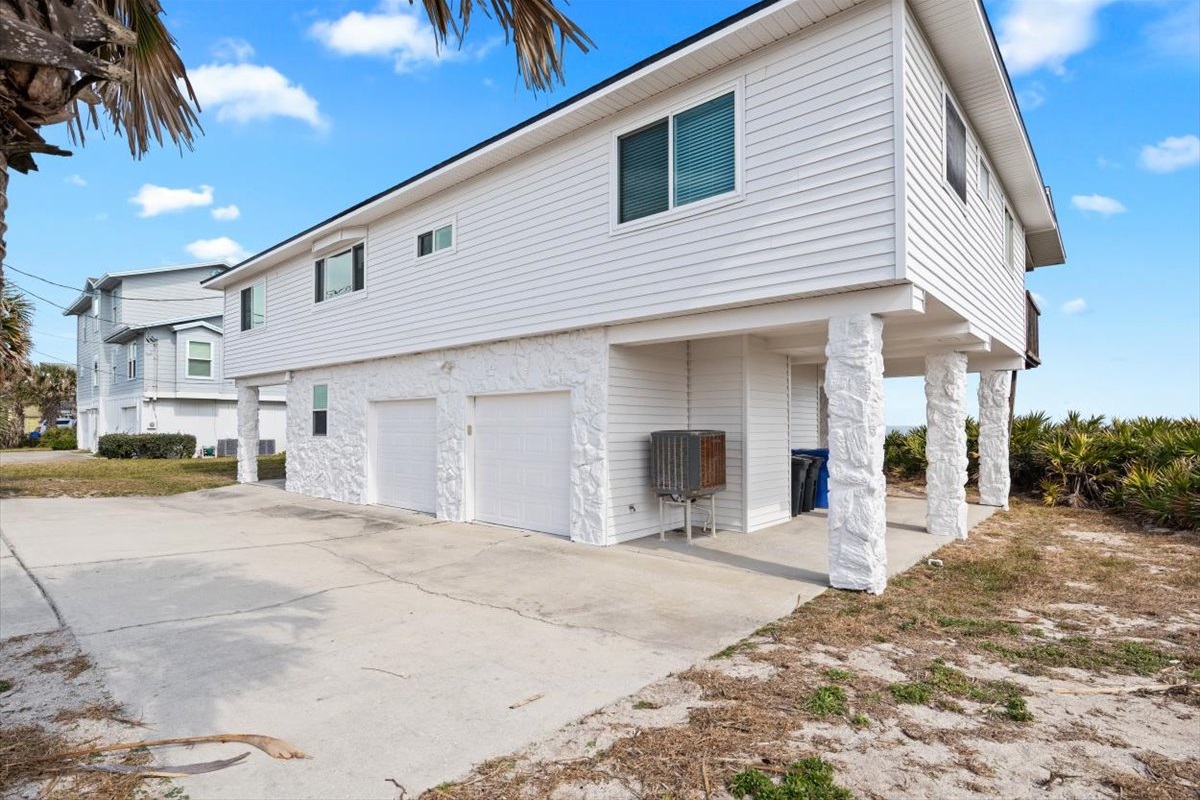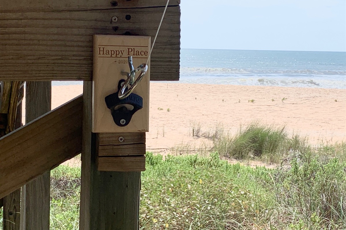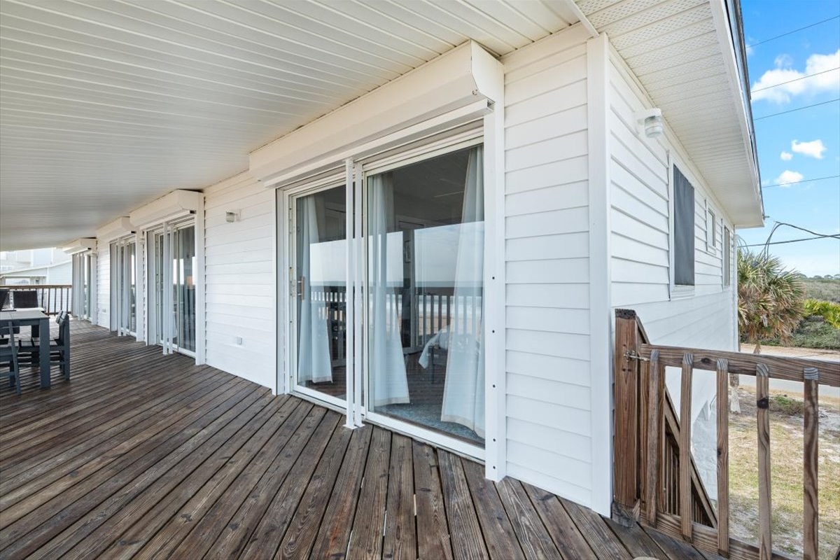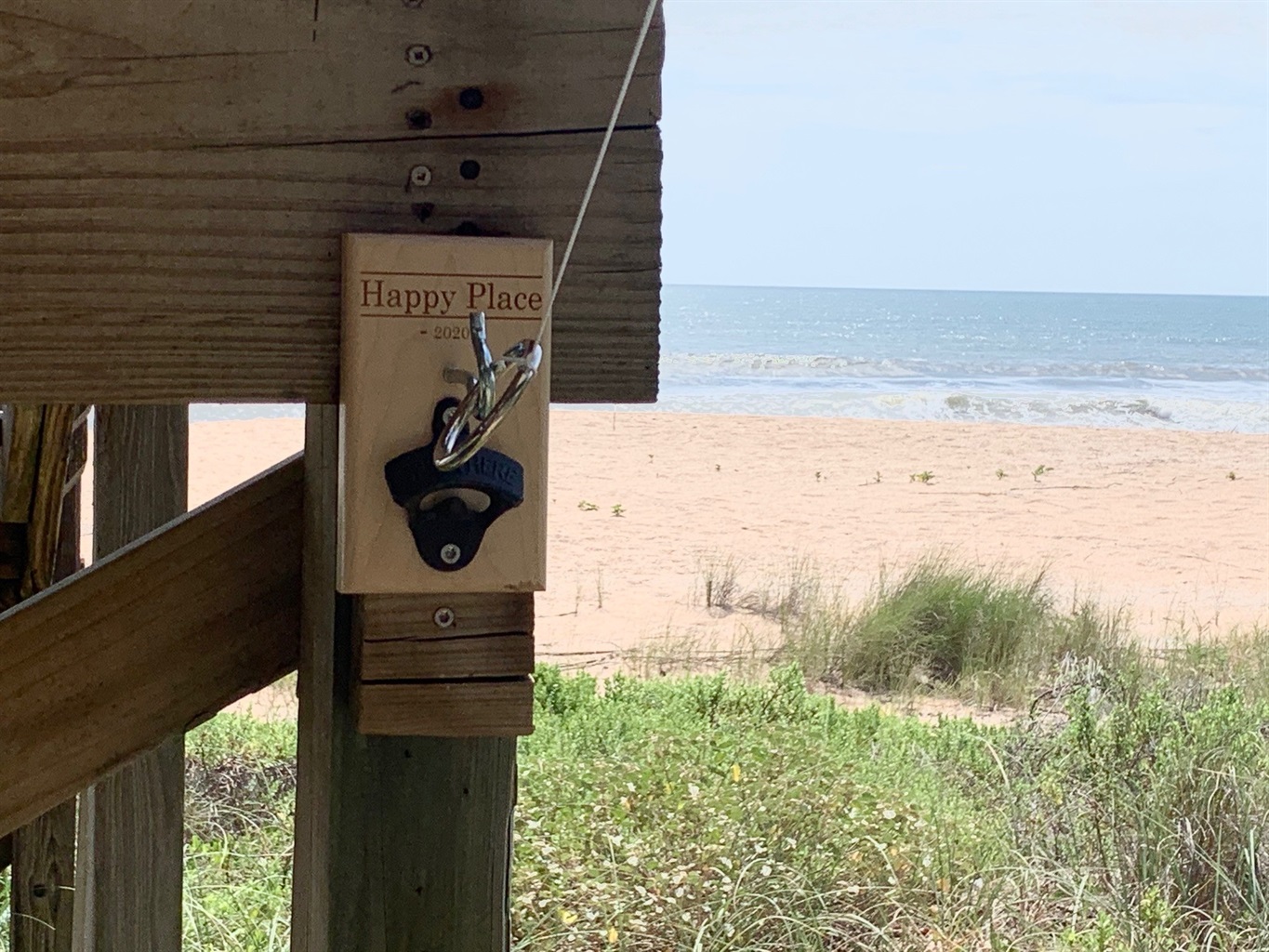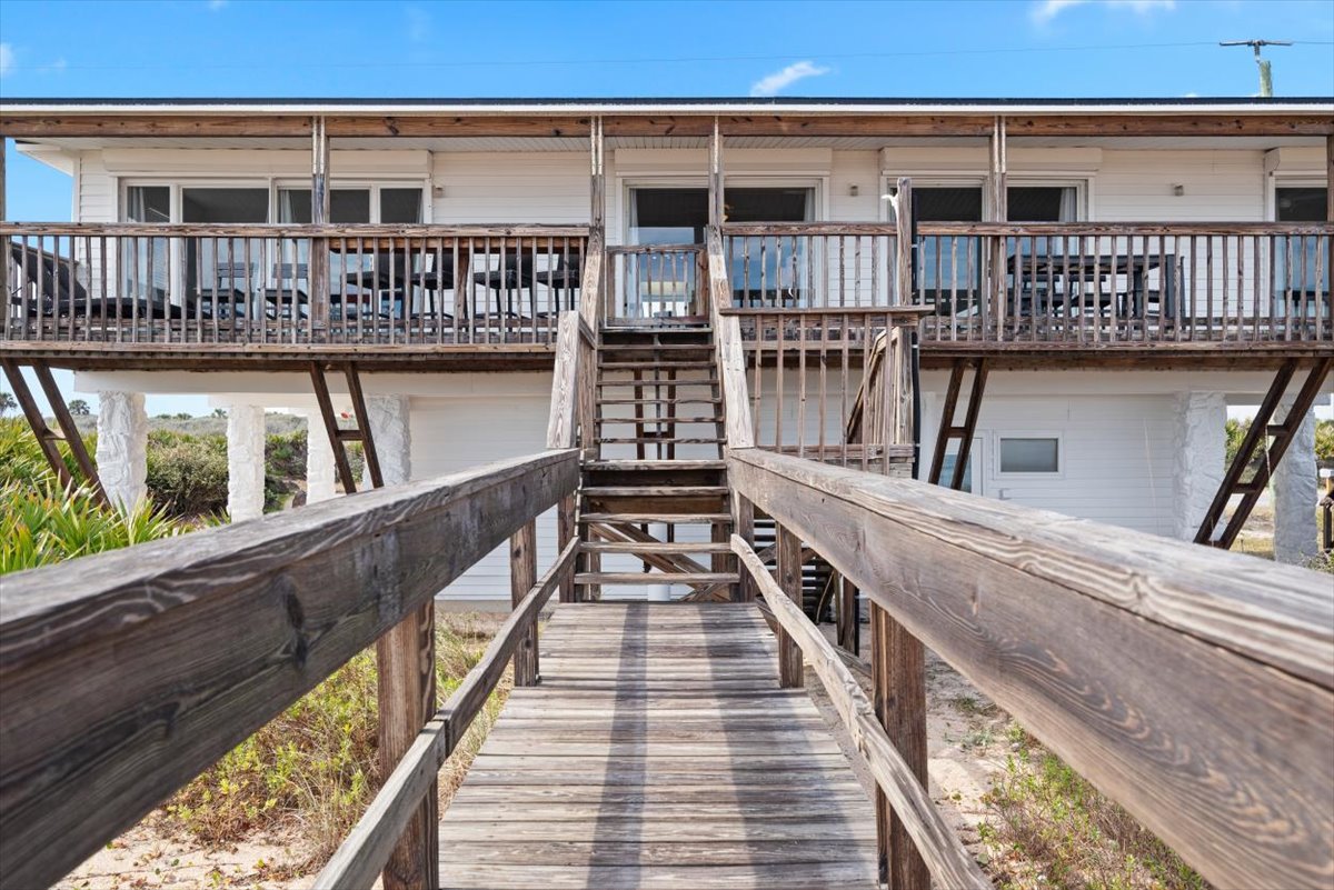 Spanning the width of the house is a covered, oceanfront balcony. It can be accessed from the living room and both of the ocean-side bedrooms. The balcony is a great place to sit and enjoy the beach, while keeping cool in the shade. We have several lounge chairs and more dining seating on the balcony. The balcony leads down to your private beach access, and has an out door shower for rinsing off the sand. When you come in from the beach, there is also a full bathroom with a shower on the ground level, as well as the laundry room. The two-car garage offers plenty of enclosed parking. Here you will find beach chairs for you to take to the sand. We also provide beach towels, gas grill with propane, books, games, and more.