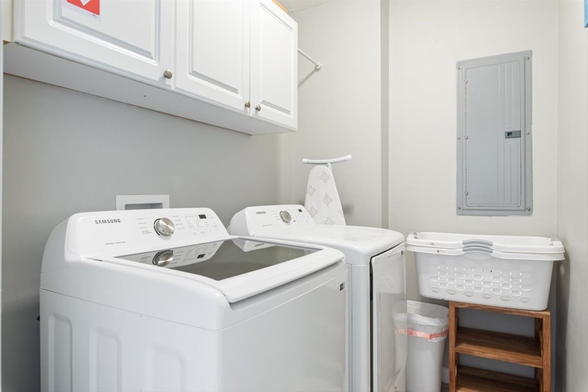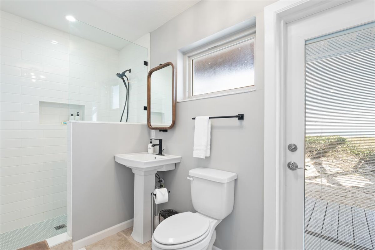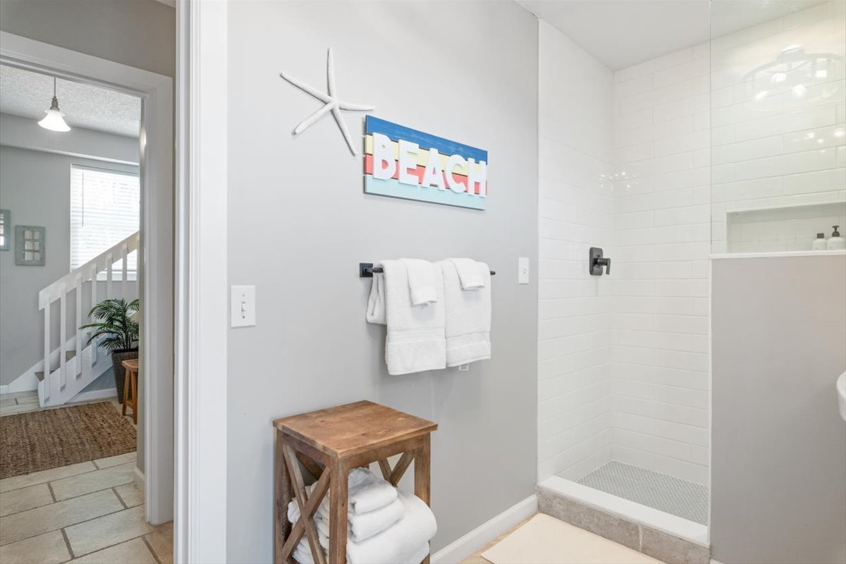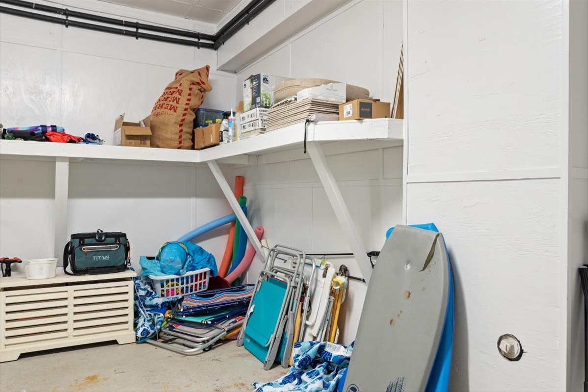 Spanning the width of the house is a covered, oceanfront balcony. It can be accessed from the living room and both of the ocean-side bedrooms. The balcony is a great place to sit and enjoy the beach, while keeping cool in the shade. We have several lounge chairs and more dining seating on the balcony. The balcony leads down to your private beach access, and has an out door shower for rinsing off the sand. When you come in from the beach, there is also a full bathroom with a shower on the ground level, as well as the laundry room. The two-car garage offers plenty of enclosed parking. Here you will find beach chairs for you to take to the sand. We also provide beach towels, gas grill with propane, books, games, and more.