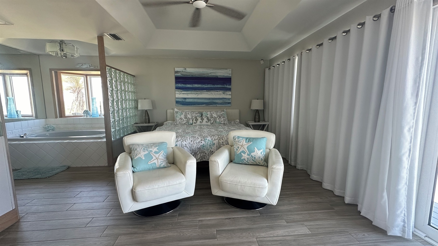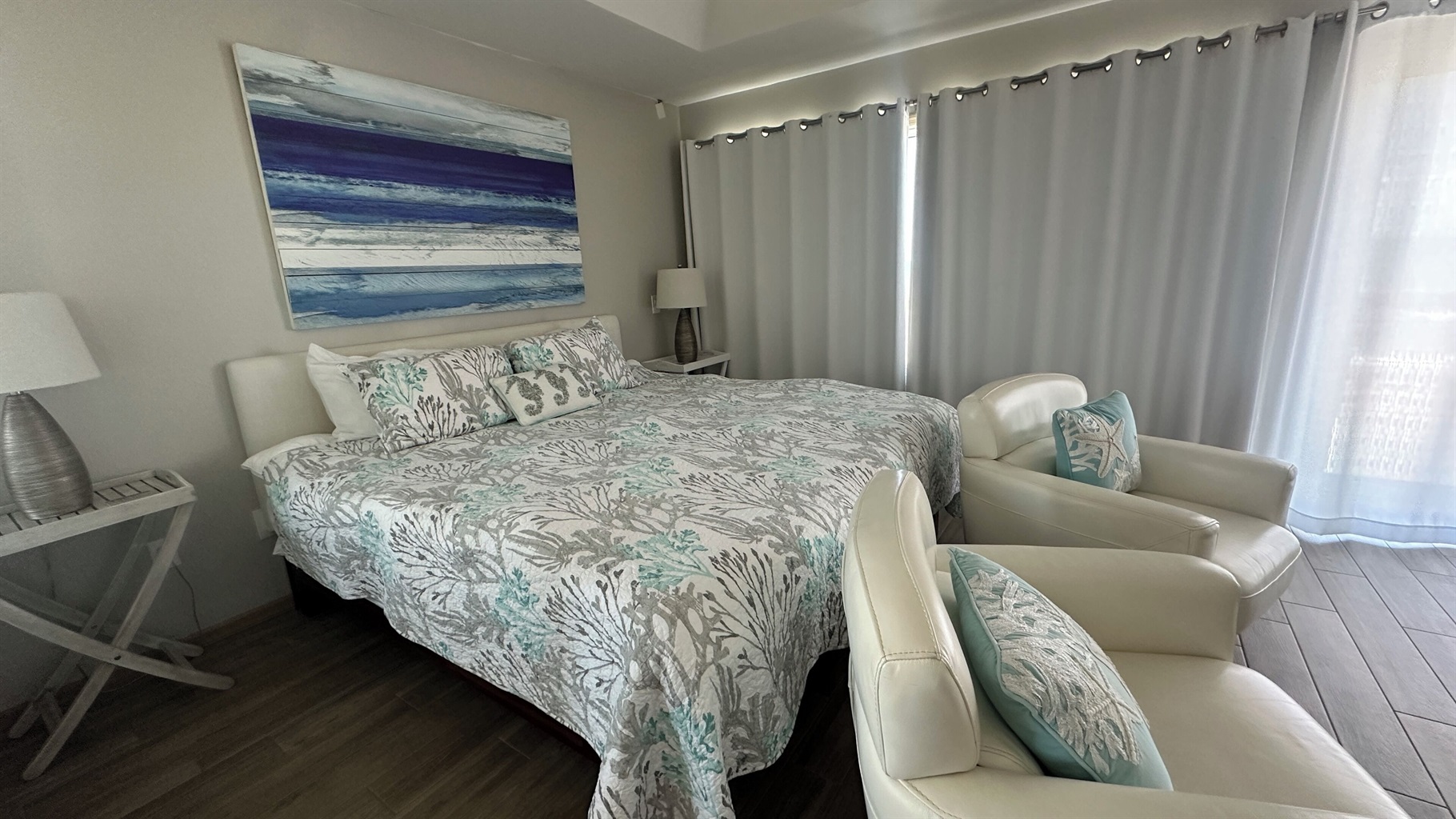One queen bed master, a guest room with two queen beds, and a private den with a pull-out sofa offers plenty of comfortable sleeping for up to 8 guests. There is a full bath with a shower that offers access directly to the deck and down to the beach.