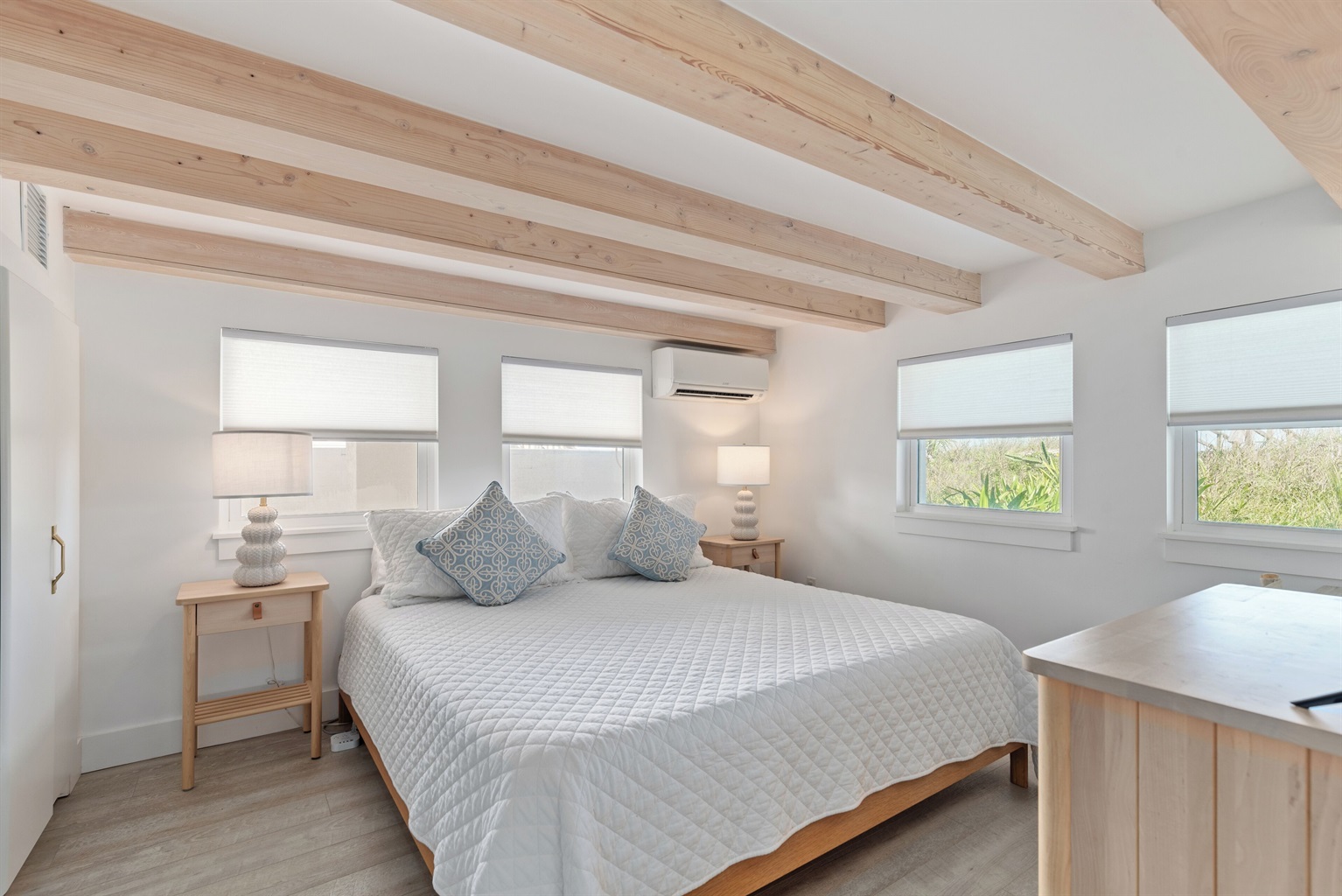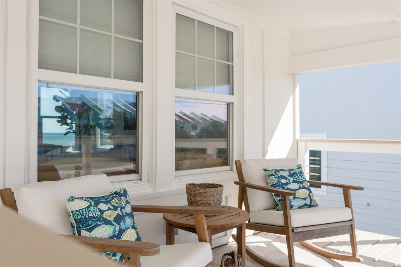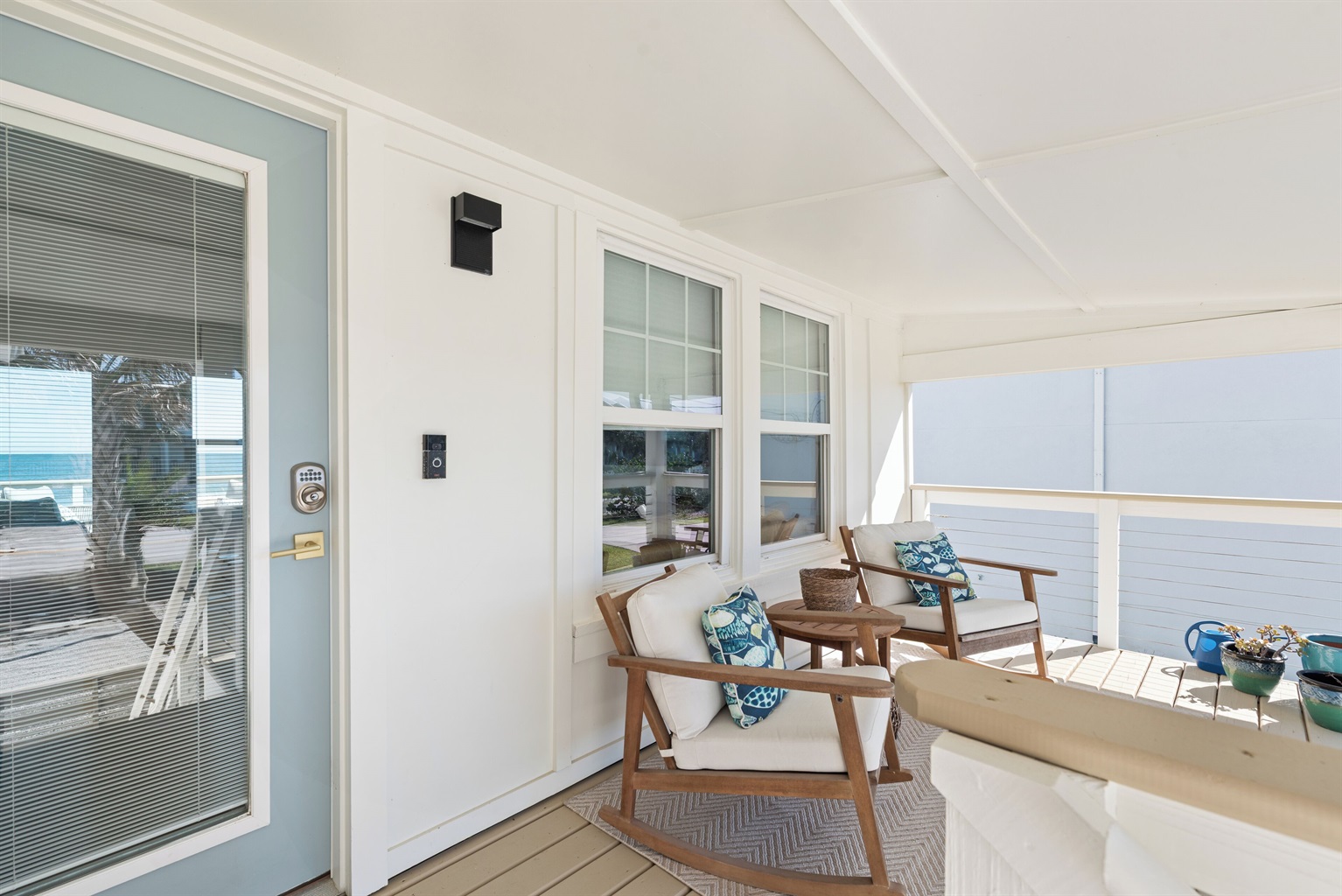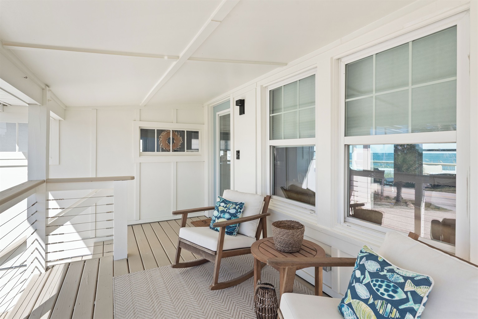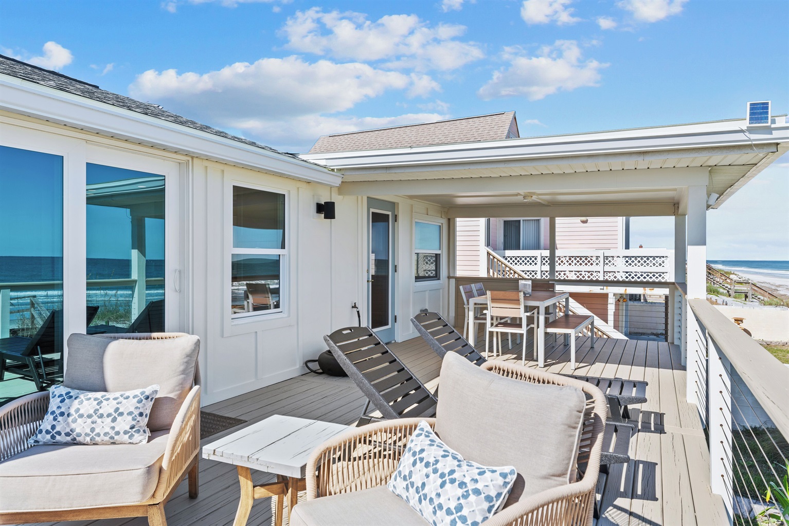 Enter through the upstairs porch and second-floor door to find an open living area with soaring ceilings and a 65” smart TV. The chef’s kitchen comes equipped with modern appliances, a breakfast bar for four, and an island with additional seating. The east-facing windows reveal sweeping Atlantic Ocean views, while the adjacent deck offers cozy lounge seating and a covered dining table for six - ideal for evening cocktails or a seaside meal.
