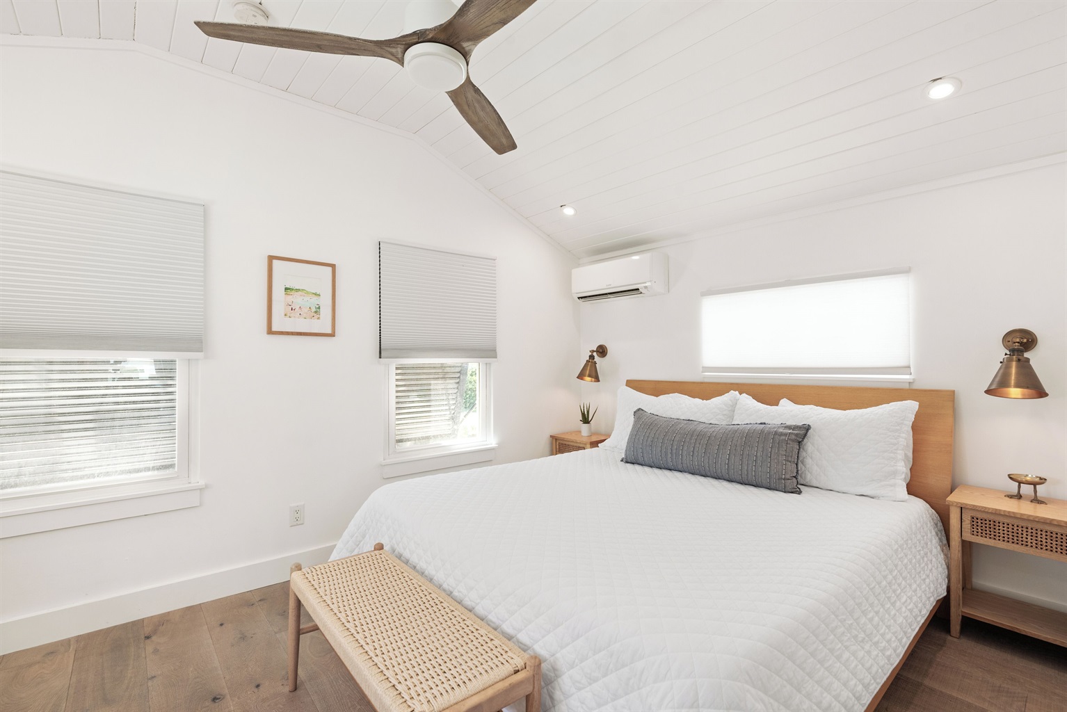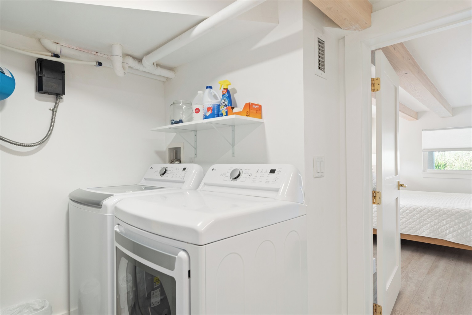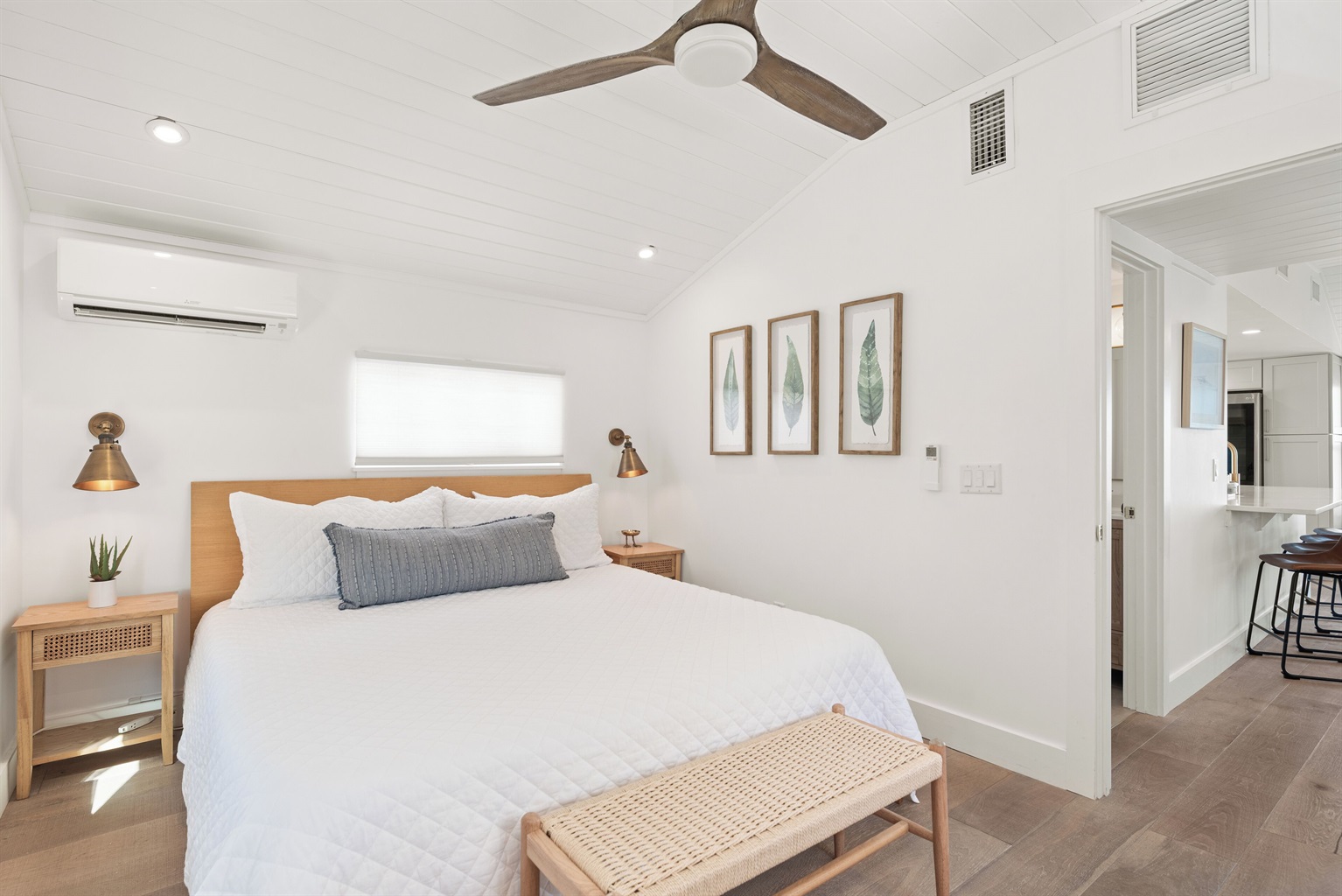 The upstairs bedroom includes a king-size memory foam bed, dresser, and closet, while the nearby bathroom is sleek and modern with everything you need for comfort.