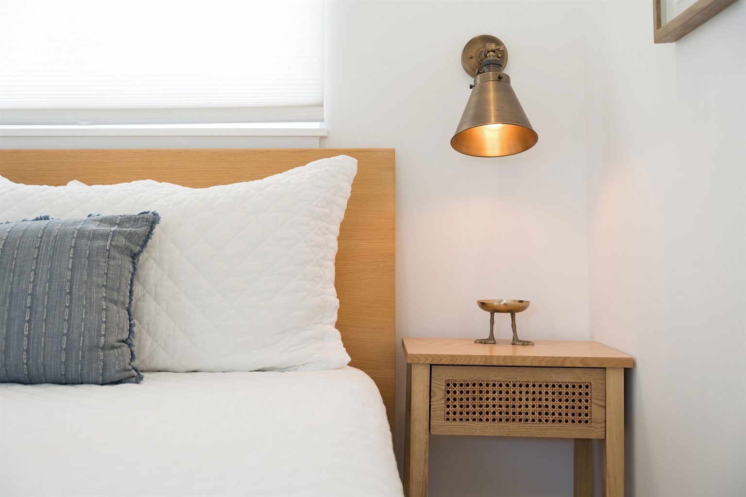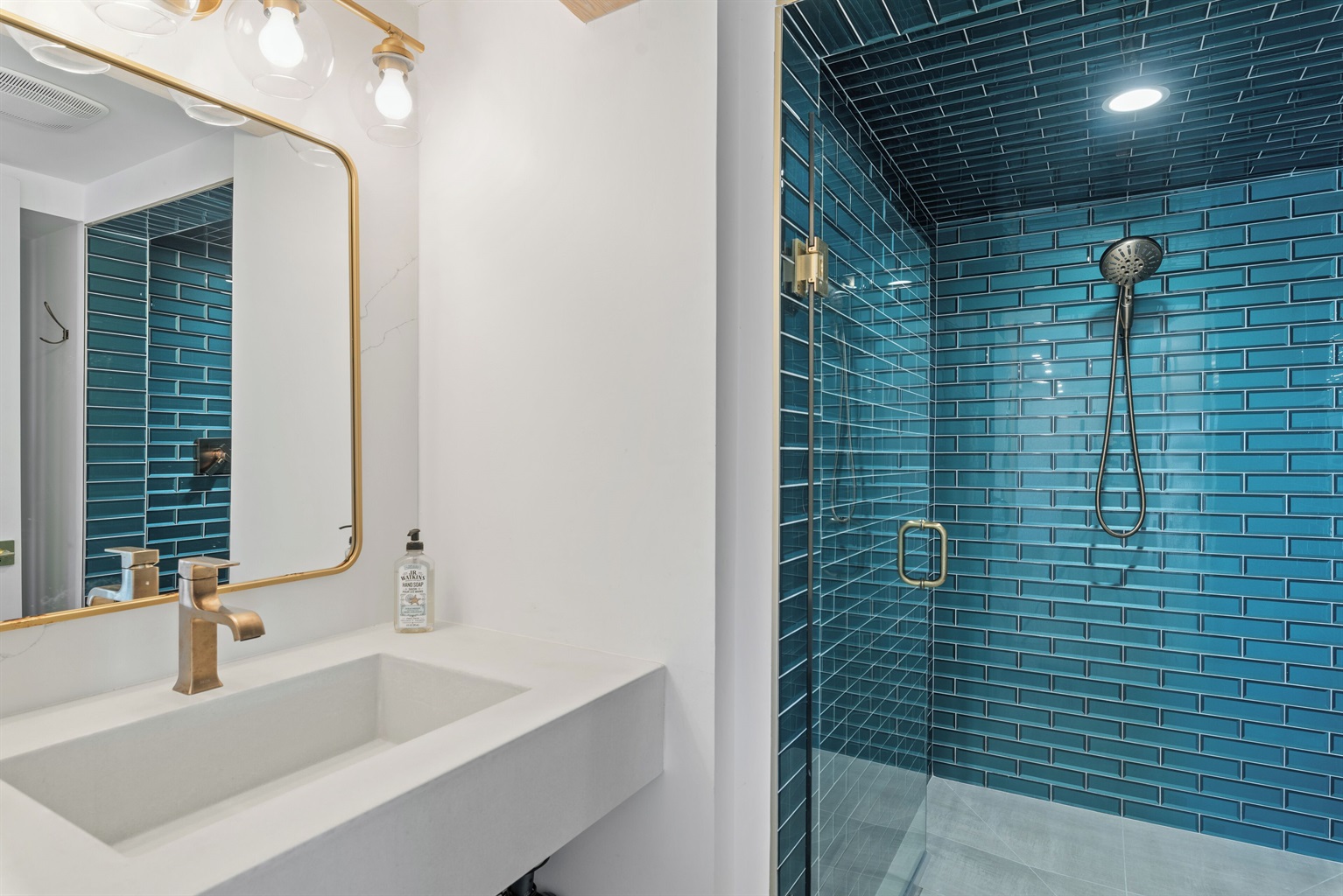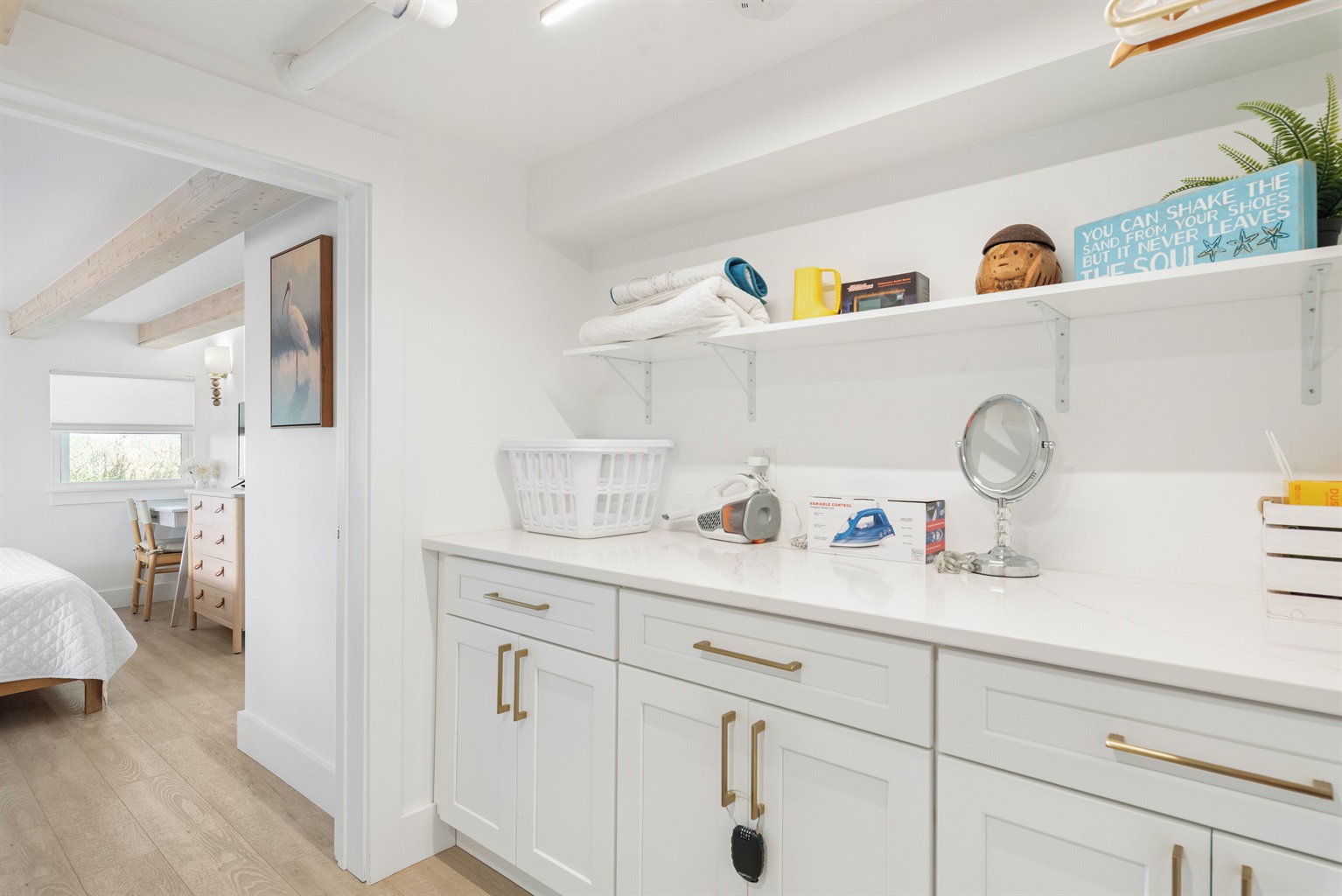 The upstairs bedroom includes a king-size memory foam bed, dresser, and closet, while the nearby bathroom is sleek and modern with everything you need for comfort.