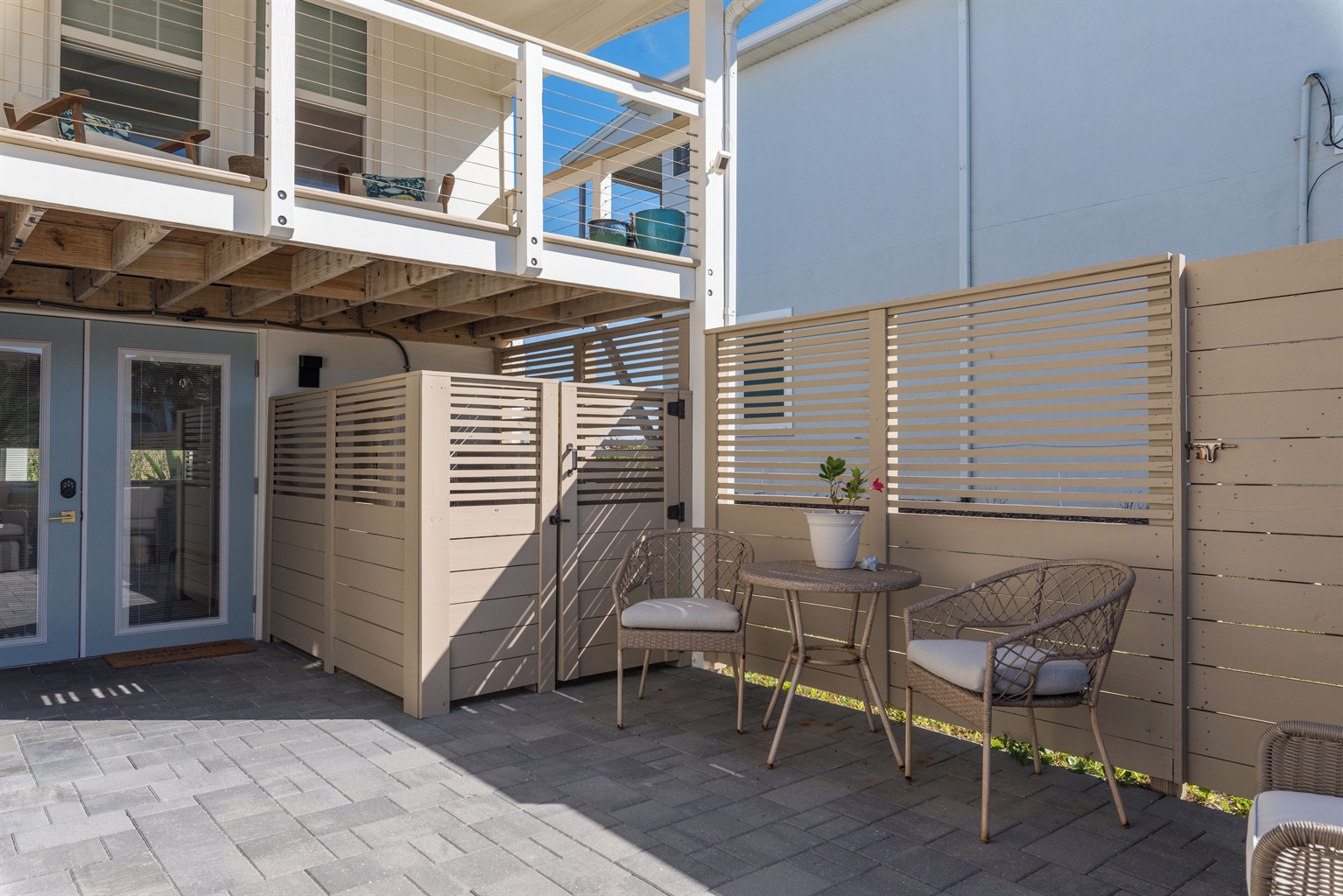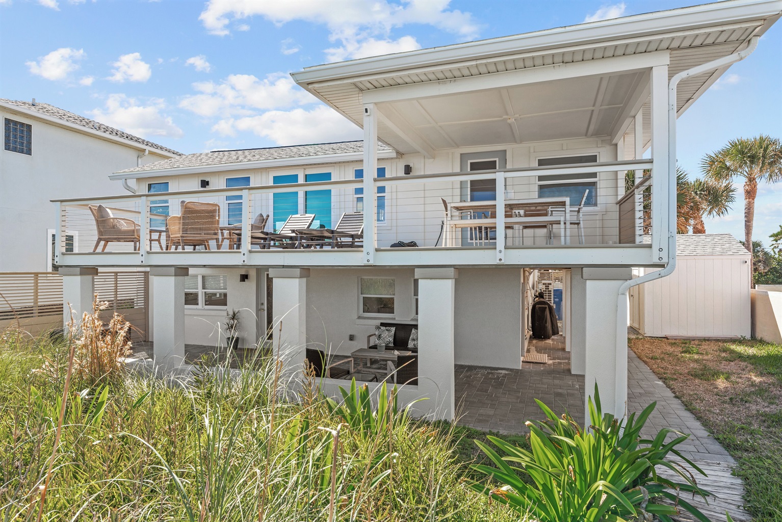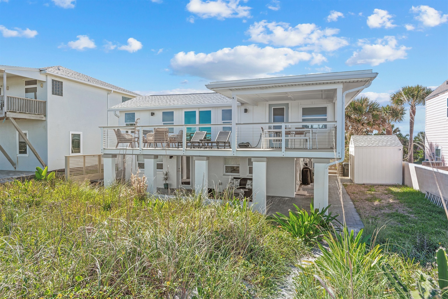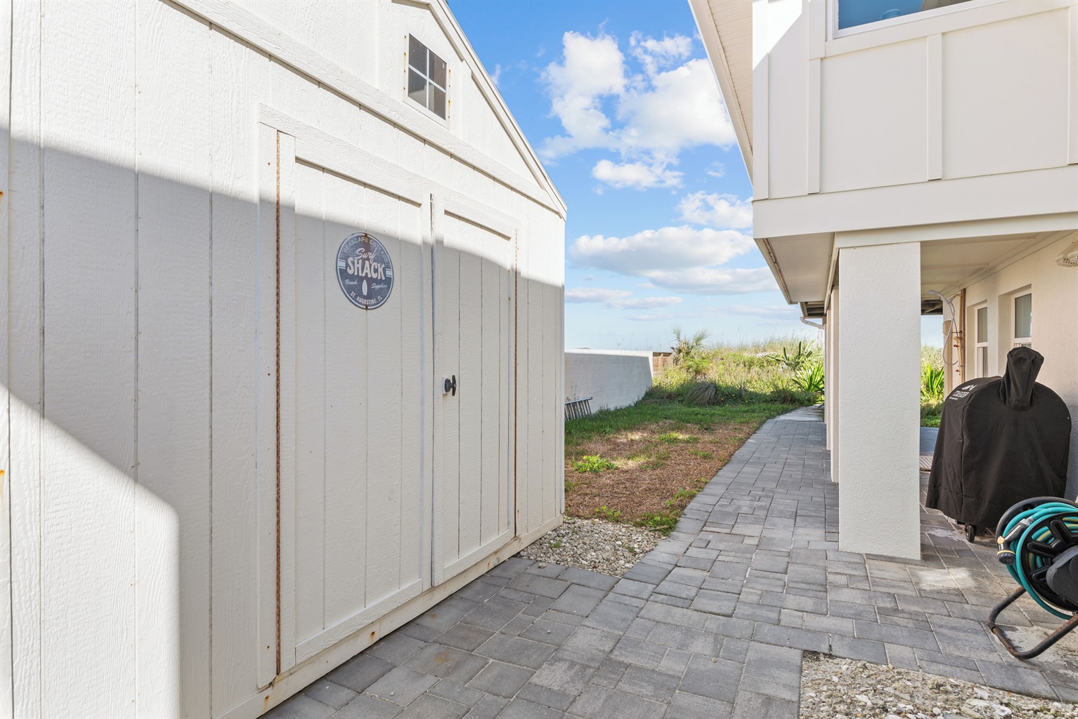 Enjoy the fenced front courtyard, complete with a sitting area, gas grill, and Traeger smoker. There’s also a storage shed with beach essentials and an outdoor shower with a foot rinse for convenience after a day in the sand.