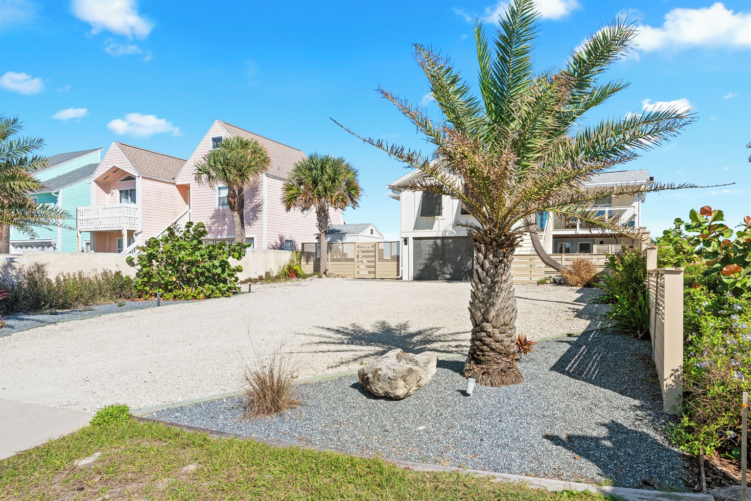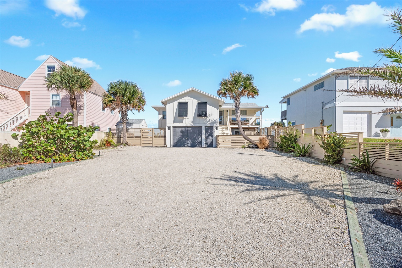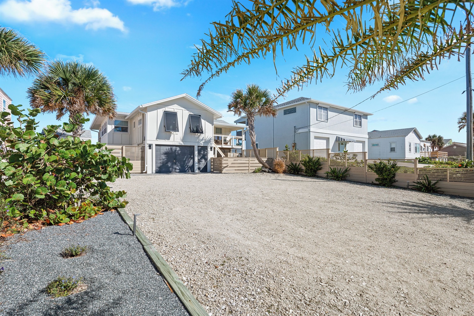 Enjoy the fenced front courtyard, complete with a sitting area, gas grill, and Traeger smoker. There’s also a storage shed with beach essentials and an outdoor shower with a foot rinse for convenience after a day in the sand.
