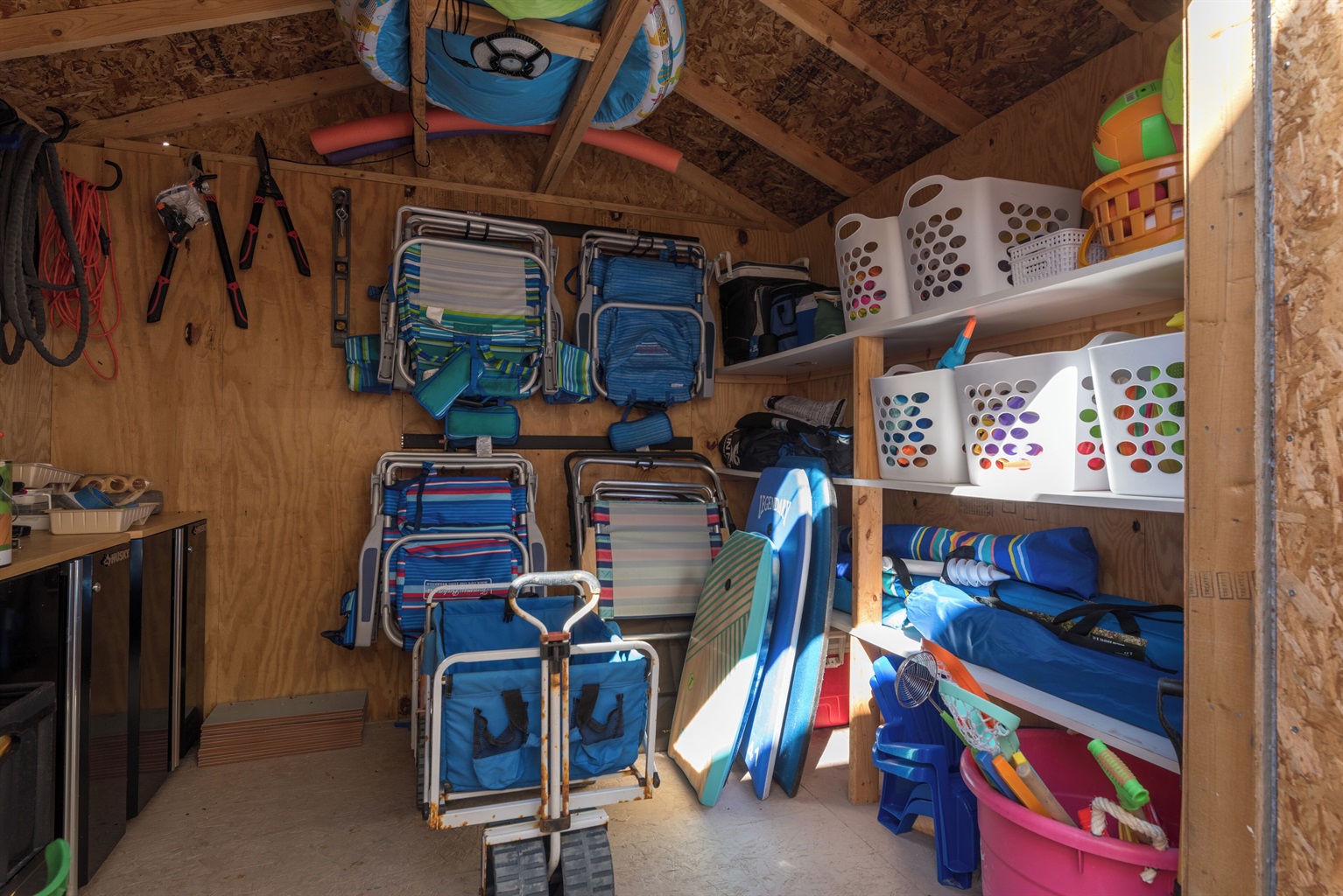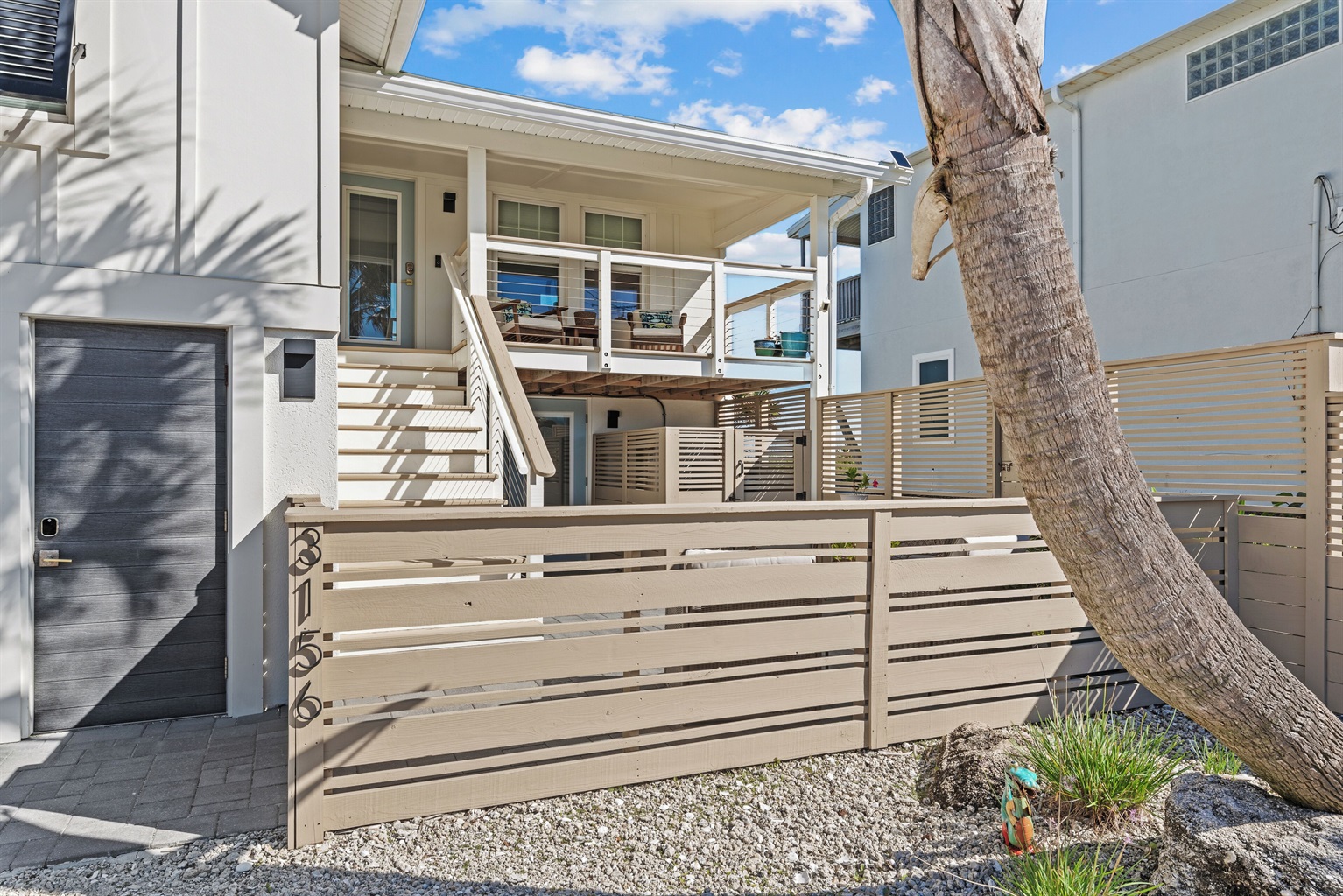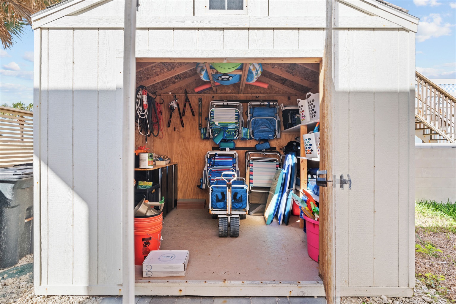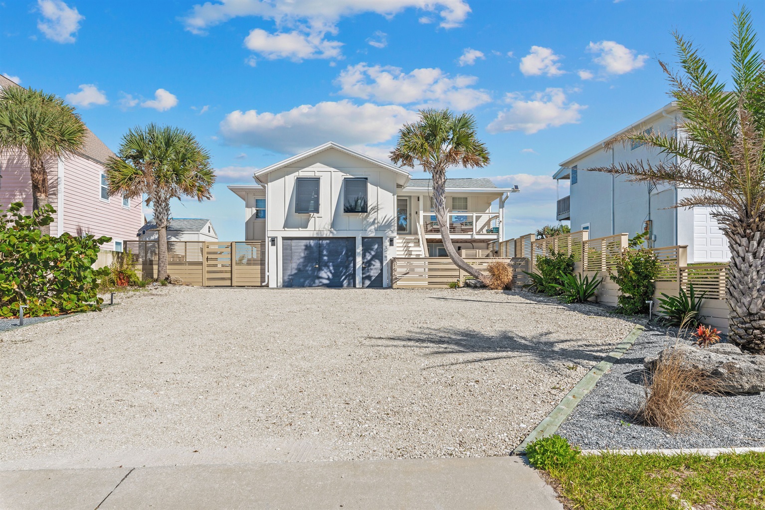 Enjoy the fenced front courtyard, complete with a sitting area, gas grill, and Traeger smoker. There’s also a storage shed with beach essentials and an outdoor shower with a foot rinse for convenience after a day in the sand.