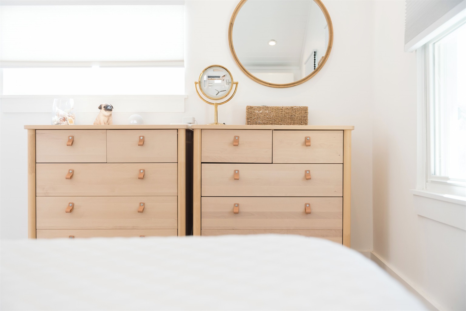 The lower level feels like a private suite. You’ll enter through French doors into a bright living room with a queen sleeper sofa, two chairs, and a 55” TV. The kitchenette includes a sink, microwave, refrigerator, and dishwasher - perfect for light meals or snacks. The bedroom offers another king memory foam bed, TV, and dresser, along with access to a spacious laundry room.