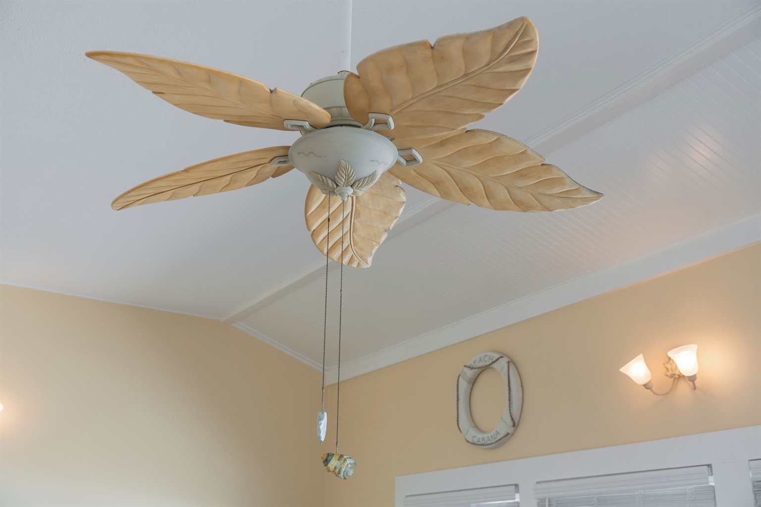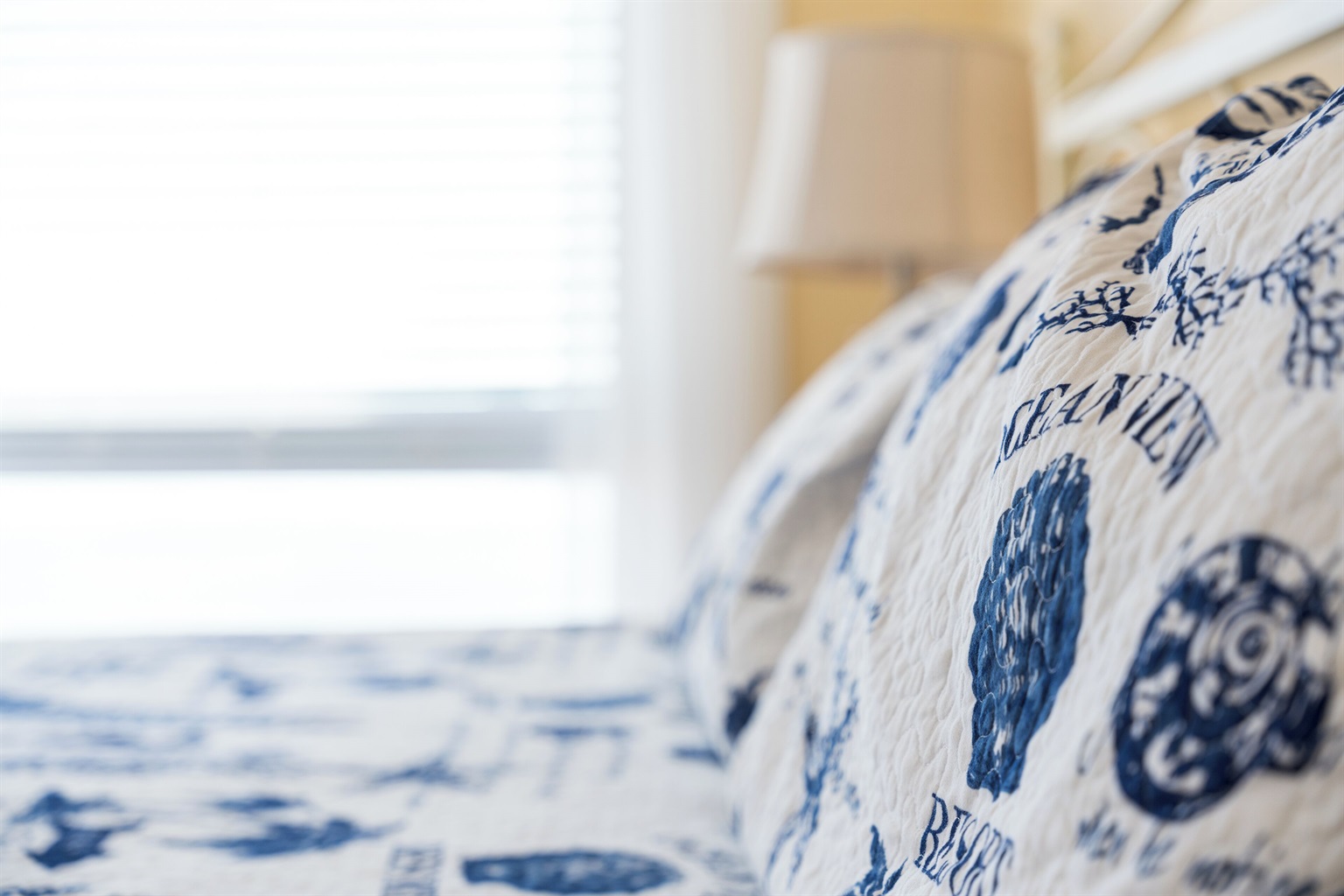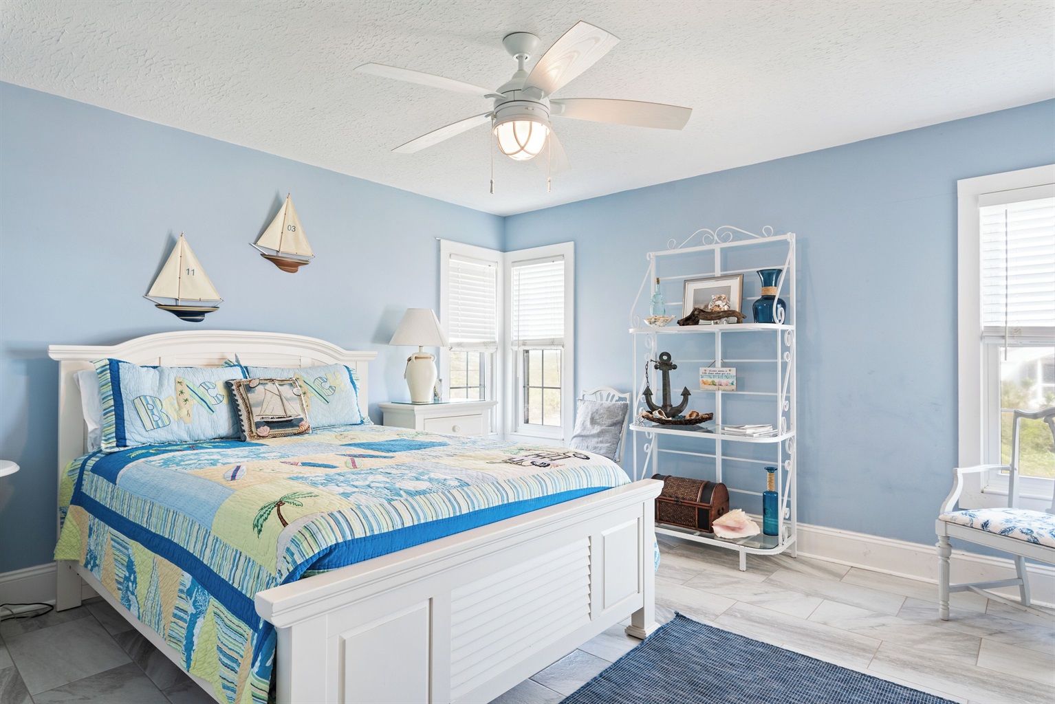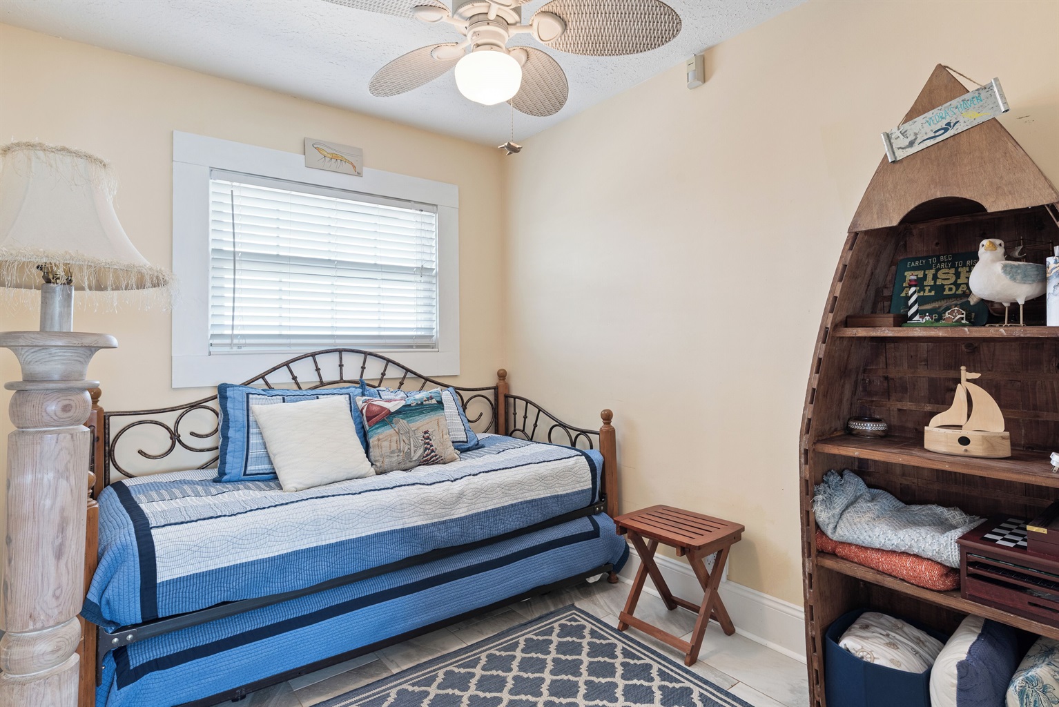 Two more bedrooms are located upstairs: one with a queen bed and partial water views, the other with a daybed and trundle—ideal for kids or extra guests. These bedrooms share a full bath with a tub/shower combination.