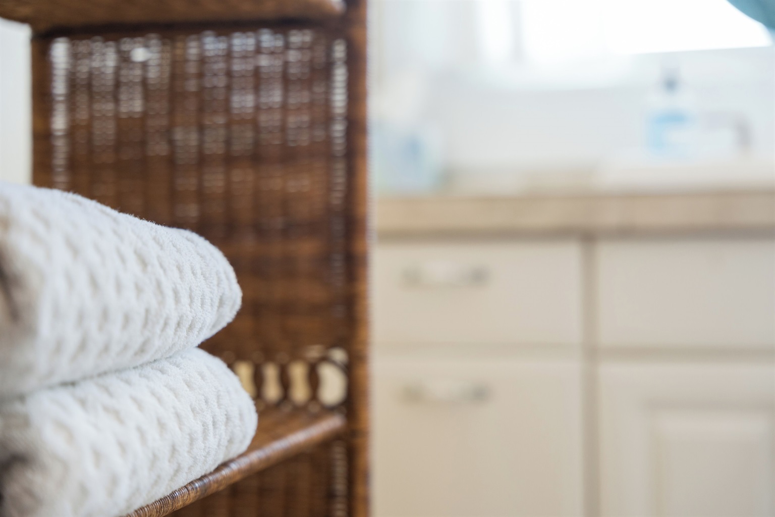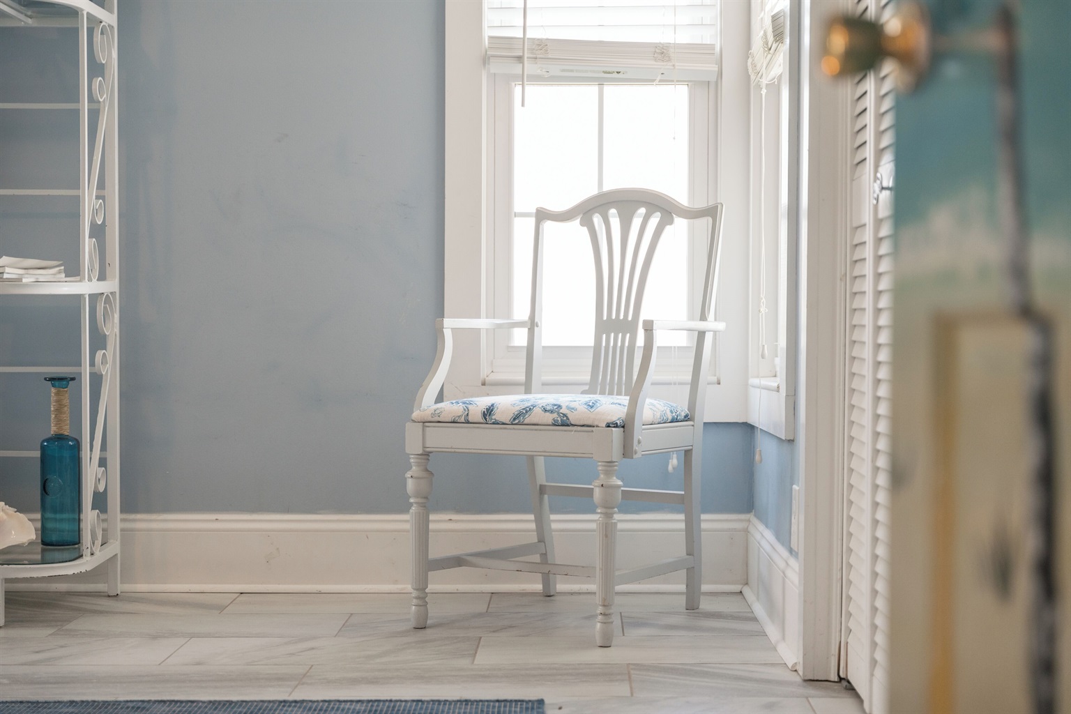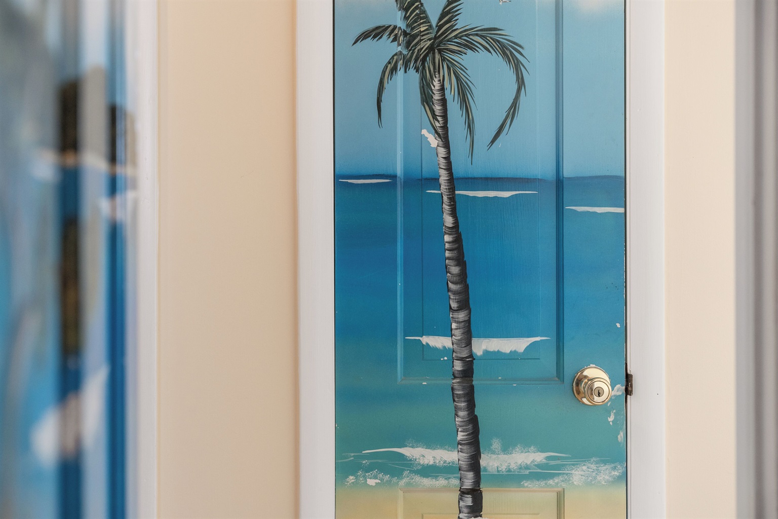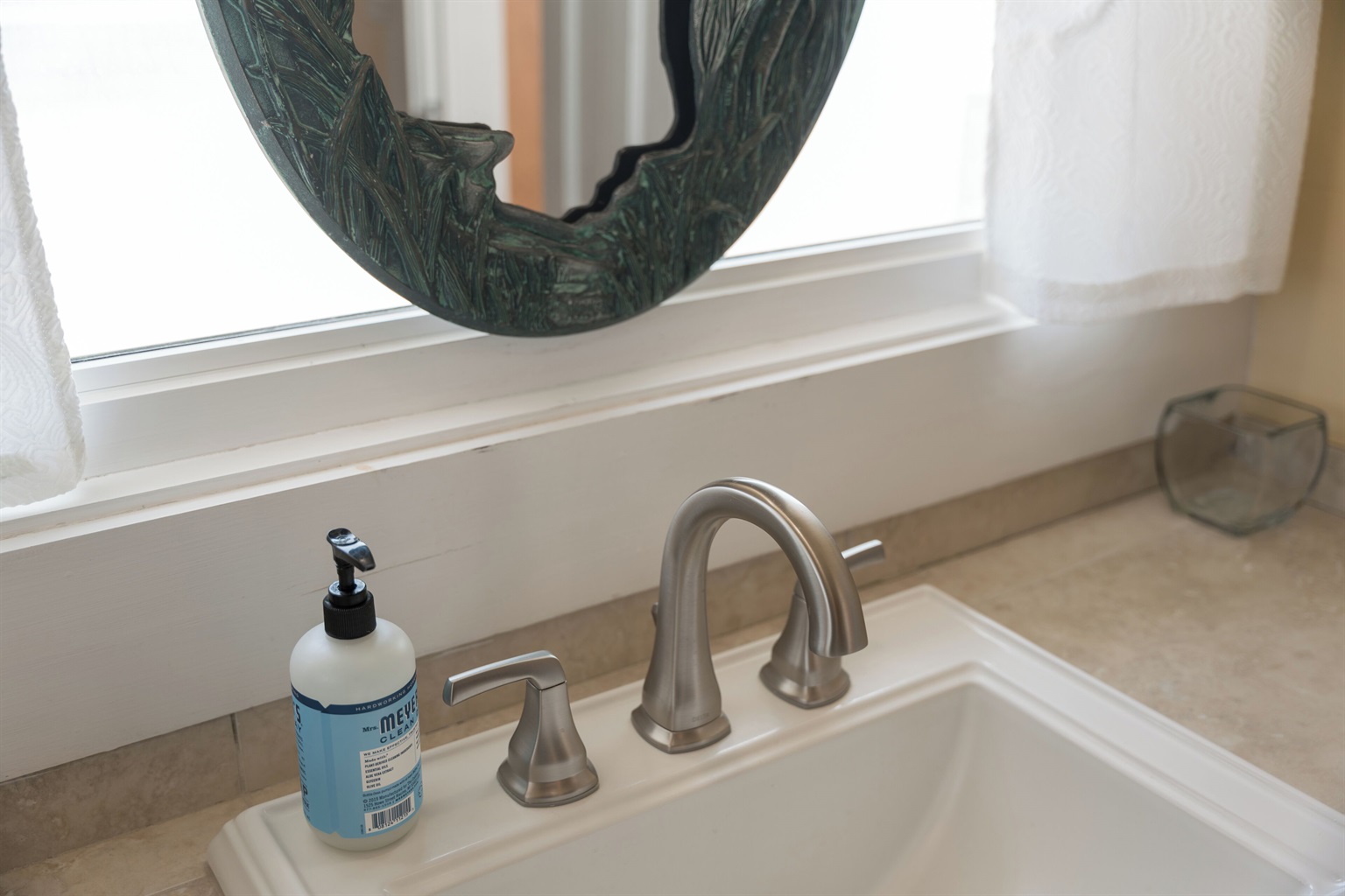 Two more bedrooms are located upstairs: one with a queen bed and partial water views, the other with a daybed and trundle—ideal for kids or extra guests. These bedrooms share a full bath with a tub/shower combination.