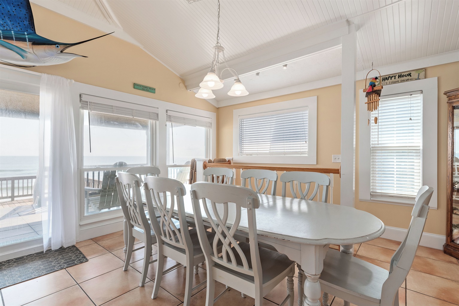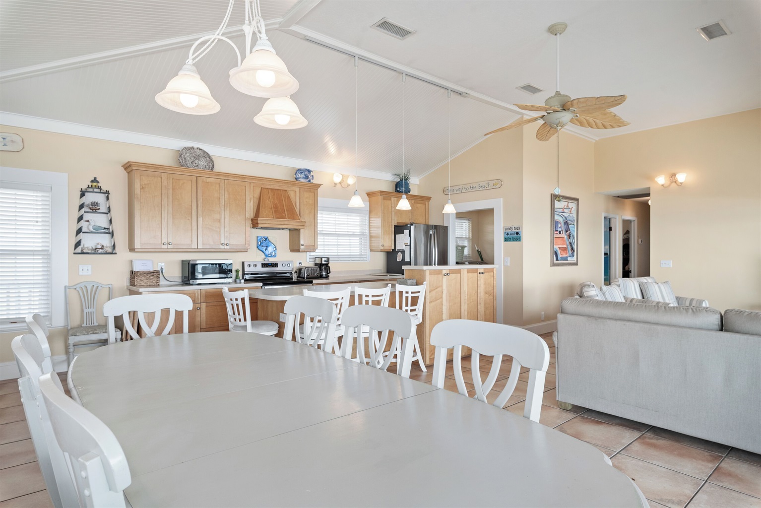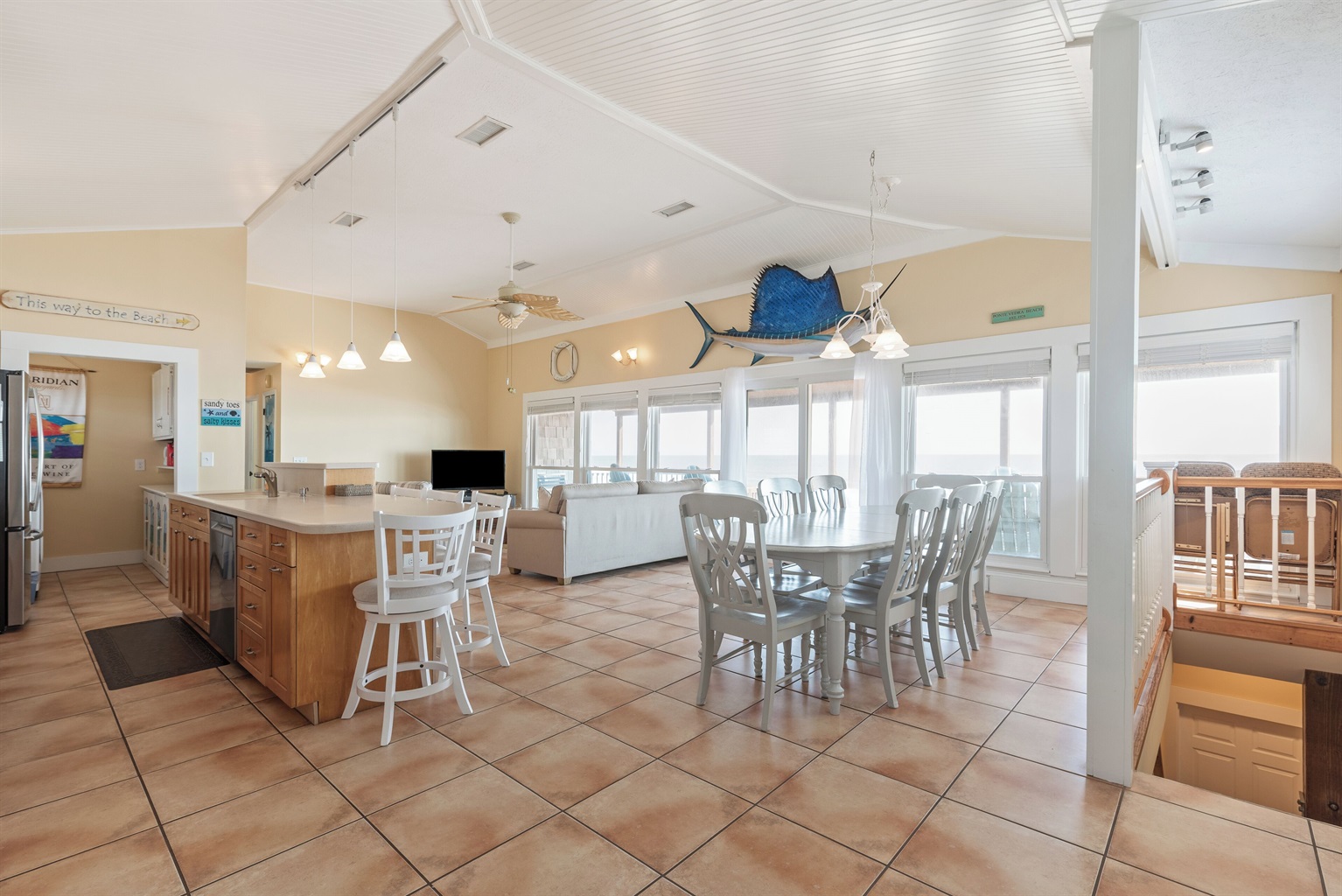 The kitchen is fully outfitted with solid-surface counters, stainless steel appliances, and a breakfast bar. You’ll find everything you need for cooking and entertaining—from dinnerware and glassware to blenders and serving pieces. The dining area, set along the oceanfront side of the home, is ideal for meals with a view. The table comfortably seats six, and with the extension leaf, up to eight. Additional bar seating is available at the counter for quick bites.