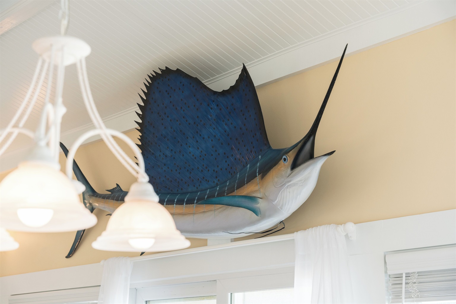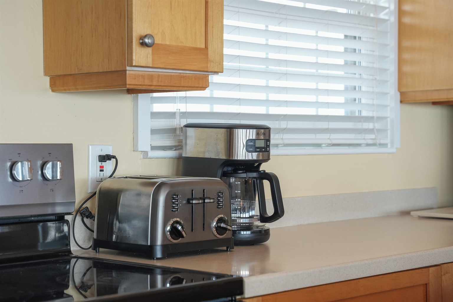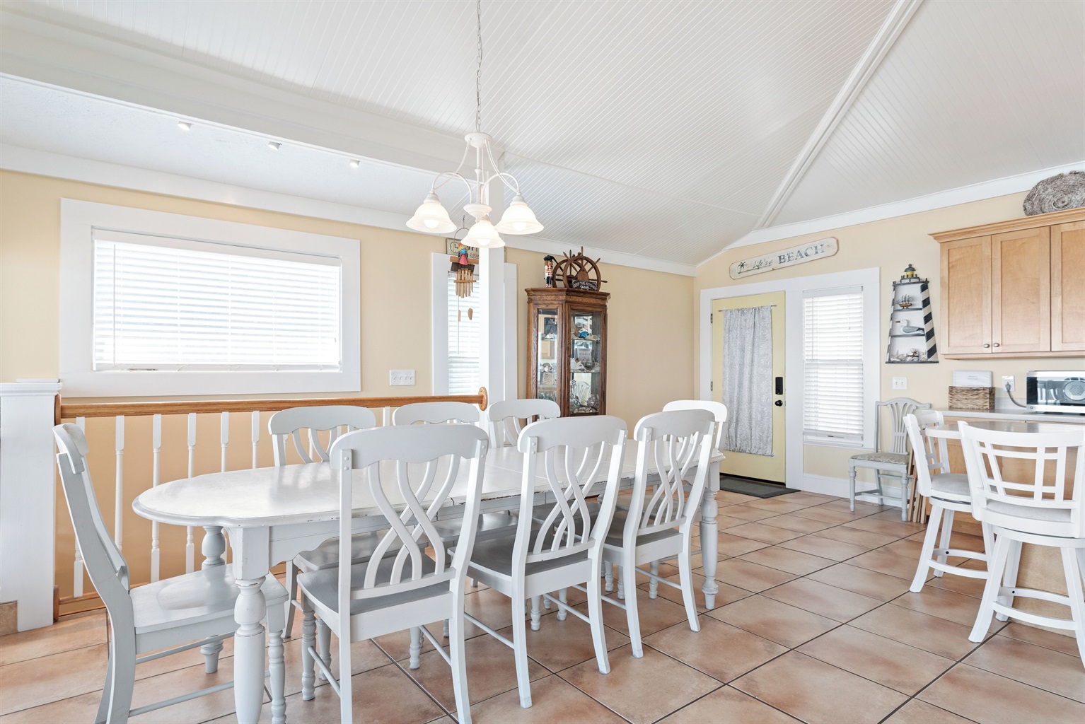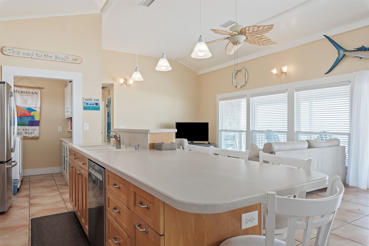 The kitchen is fully outfitted with solid-surface counters, stainless steel appliances, and a breakfast bar. You’ll find everything you need for cooking and entertaining—from dinnerware and glassware to blenders and serving pieces. The dining area, set along the oceanfront side of the home, is ideal for meals with a view. The table comfortably seats six, and with the extension leaf, up to eight. Additional bar seating is available at the counter for quick bites.