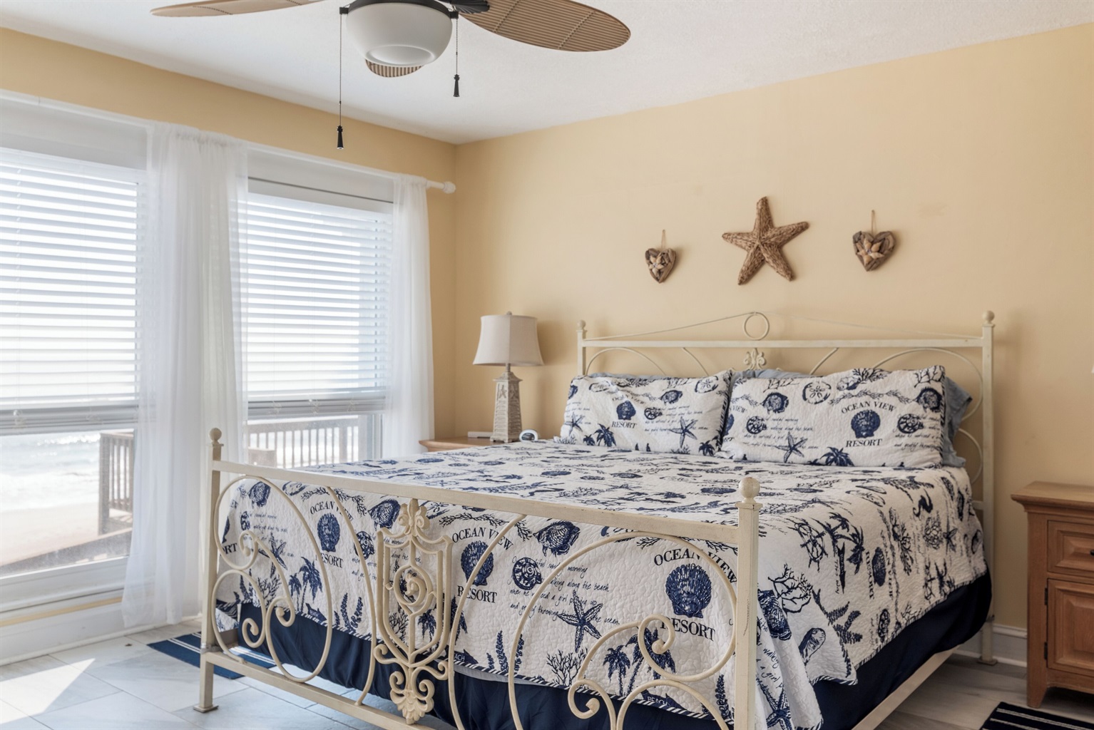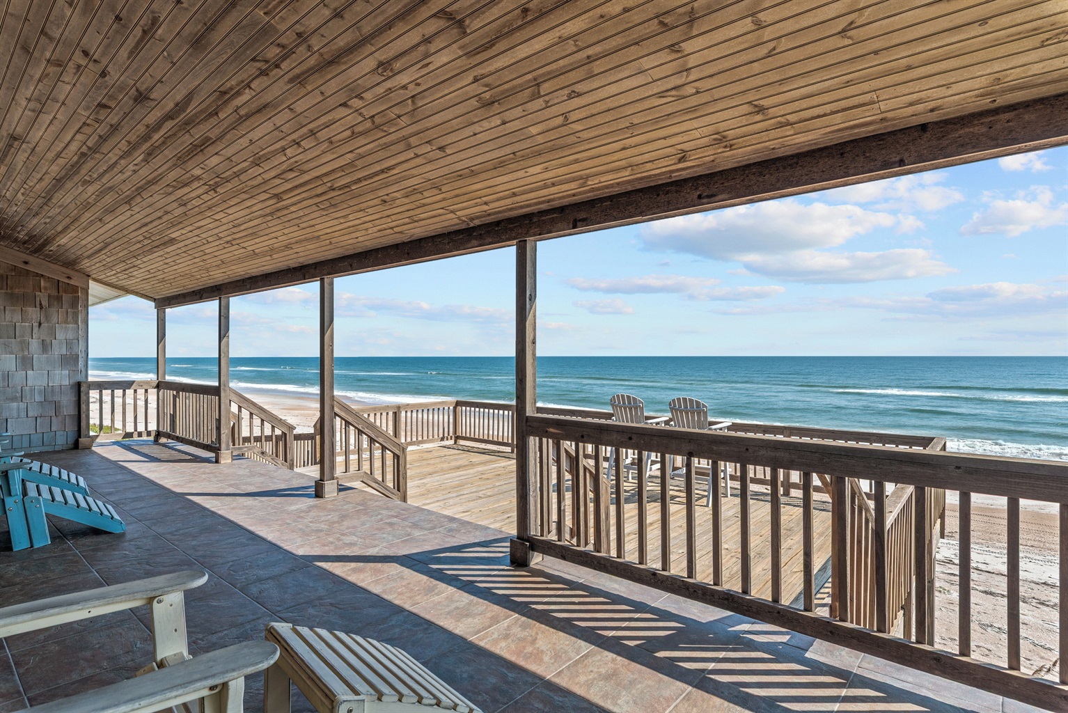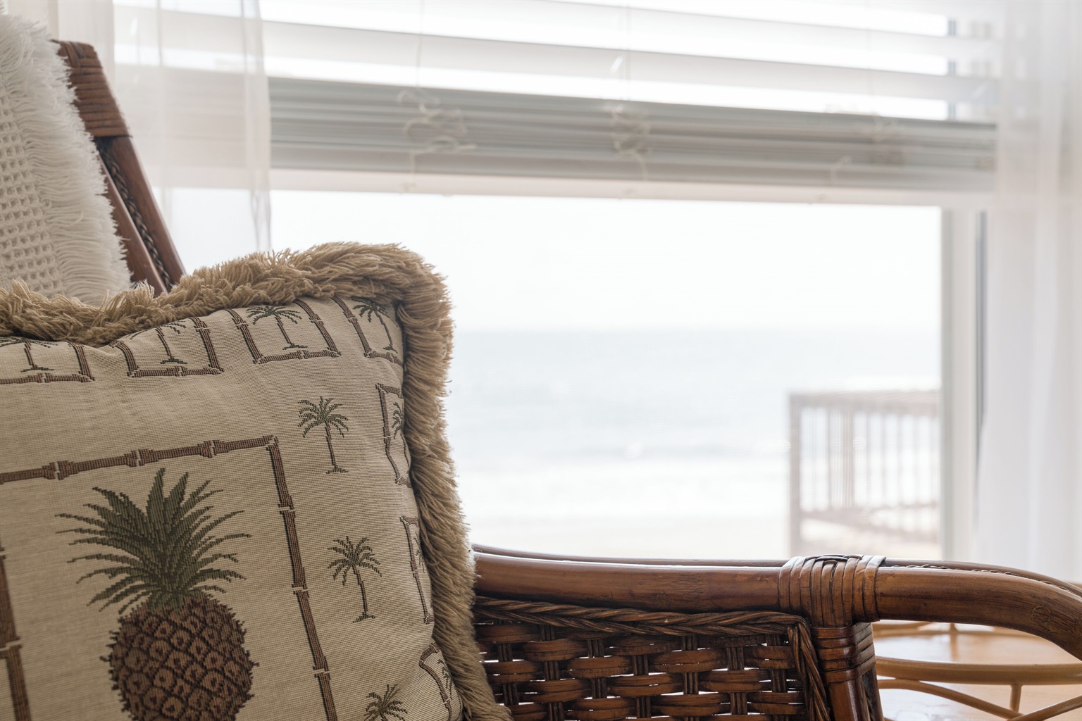 The living area is comfortably furnished with a sofa and oversized chairs arranged around a 48″ flat-screen TV. But no matter where you sit, the panoramic ocean views steal the show. A laundry room, conveniently located off the kitchen, rounds out this main level.