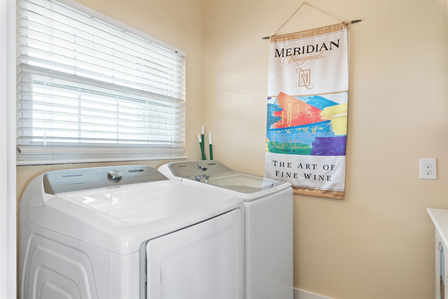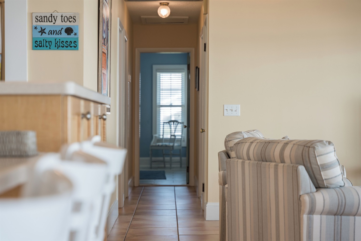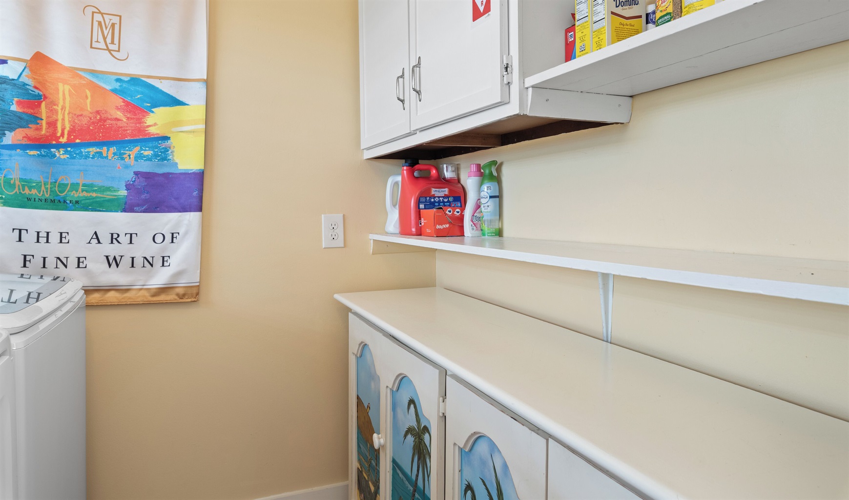 The living area is comfortably furnished with a sofa and oversized chairs arranged around a 48″ flat-screen TV. But no matter where you sit, the panoramic ocean views steal the show. A laundry room, conveniently located off the kitchen, rounds out this main level.