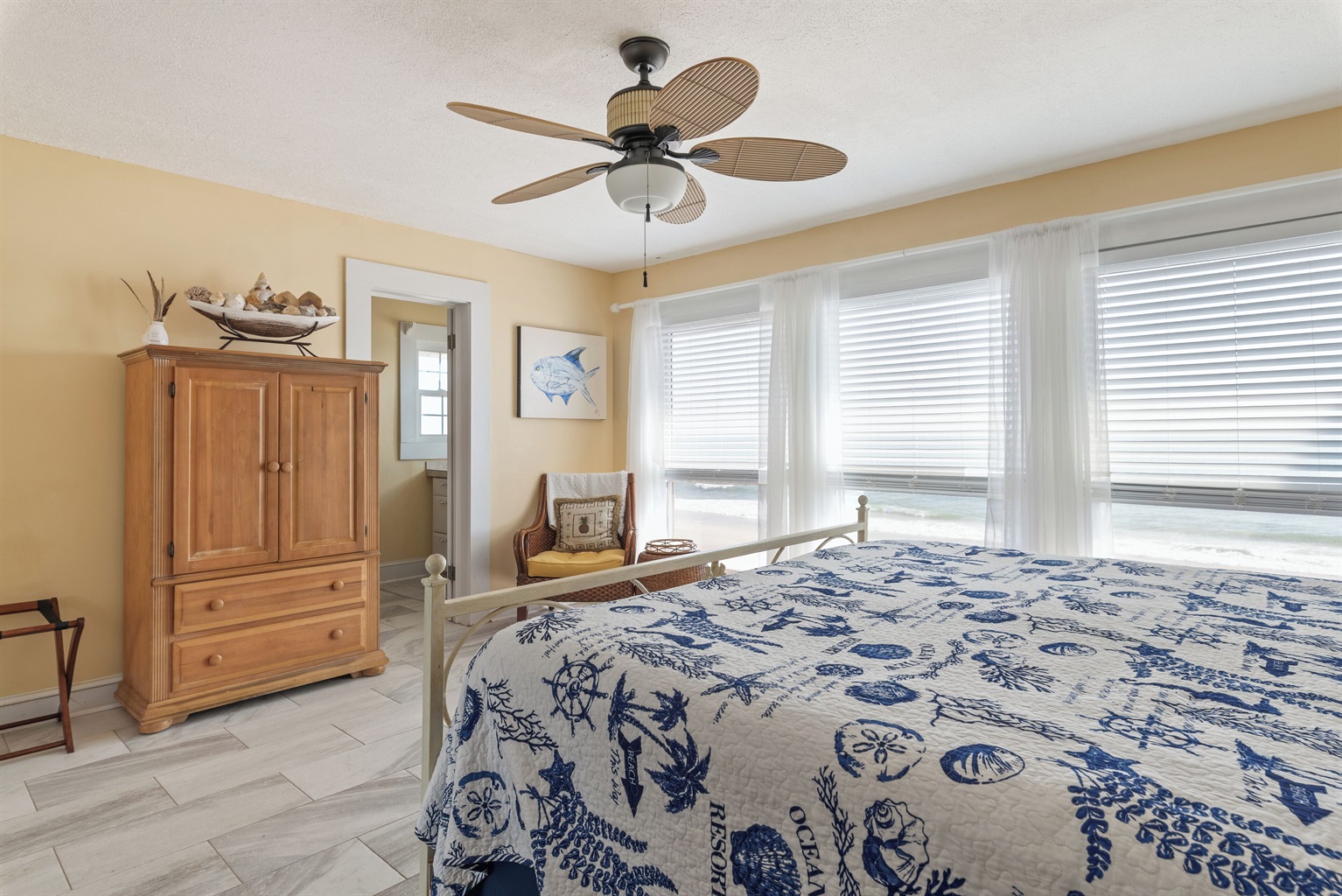 The primary suite continues the coastal experience, with three large ocean-facing windows and a king bed positioned for sunrise views. A dresser, nightstands with reading lamps, and a 32″ TV add comfort. The en-suite bathroom features a walk-in shower and vanity with ocean views.
